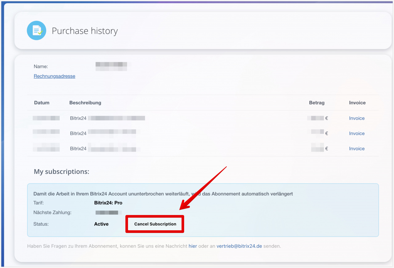 Die automatische Verлängerung des Abonnements wird nicht aktiviert, wenn Sie Ihren kostenpflichtigen Tarif direkt über einen Bitrix-Partner in Ihrer Region erworben haben. In diesem Fall sollten Sie Ihren Bitrix24-Partner mindestens eine Woche vor Ablauf des Abonnements darüber informieren, dass Sie Ihr kostenpflichtiges Abonnement nicht weiter verlängern möchten.