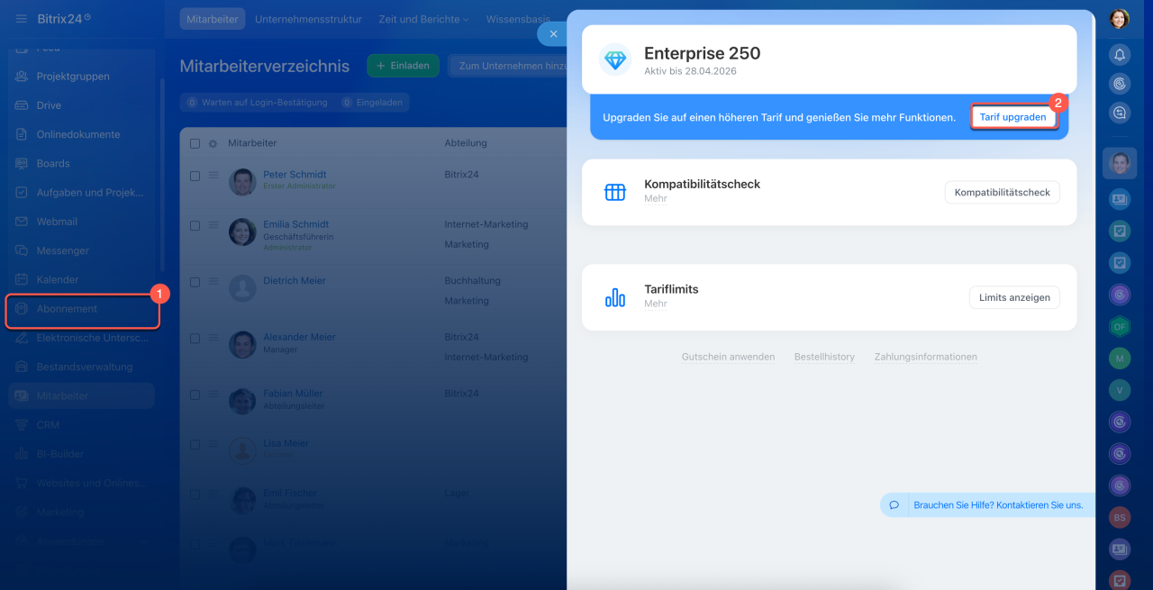 Sie können Ihren Tarif jederzeit direkt in Ihrem Bitrix24-Account auf einen anderen Tarif upgraden oder wechseln – entweder über den Bereich Abonnement oder über das Widget Mein Tarif.