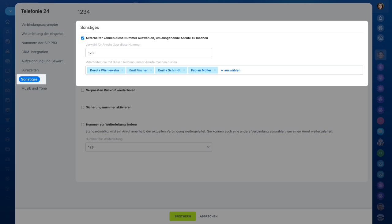 Damit Mitarbeiter zusätzliche Nummern für ausgehende Anrufe nutzen können, die weder in den allgemeinen noch in den persönlichen Einstellungen hinterlegt sind, fügen Sie den Mitarbeiter in den Einstellungen jeder Nummer unter Sonstiges – Mitarbeiter können diese Nummer auswählen, um ausgehende Anrufe zu machen“ hinzu.