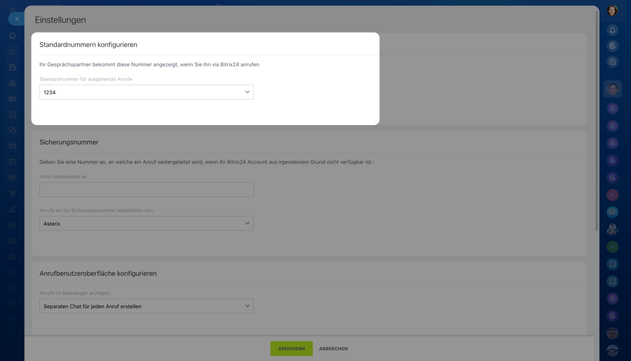 In der Bitrix24-Telefonie können Sie festlegen, welche Nummern für ausgehende Anrufe verwendet werden – sowohl in den allgemeinen Einstellungen als auch in den individuellen Nutzer-Einstellungen. Wenn diese Nummern unterschiedlich sind, kann der Mitarbeiter nur die Nummer aus seinen persönlichen Einstellungen verwenden.
