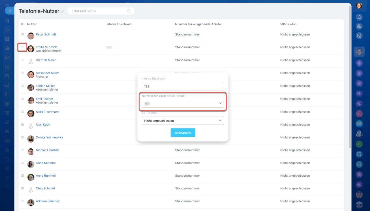 In Bitrix24 können Sie mehrere Telefonnummern verbinden. Während die allgemeine Nummer in den Telefonie-Einstellungen festgelegt wird, können Sie jedem Mitarbeiter eine individuelle Nummer zuweisen. Gehen Sie dazu in den Bereich Telefonie > Telefonie konfigurieren > Telefonie-Nutzer.
