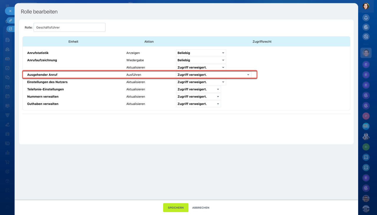 Sie können den Zugriff auf ausgehende Anrufe für bestimmte Mitarbeiter einschränken oder verweigern. Öffnen Sie dazu die Einstellungen der entsprechenden Rolle und wählen Sie im Feld „Ausgehende Anrufe“ den Punkt „Zugriff verweigert“ aus.