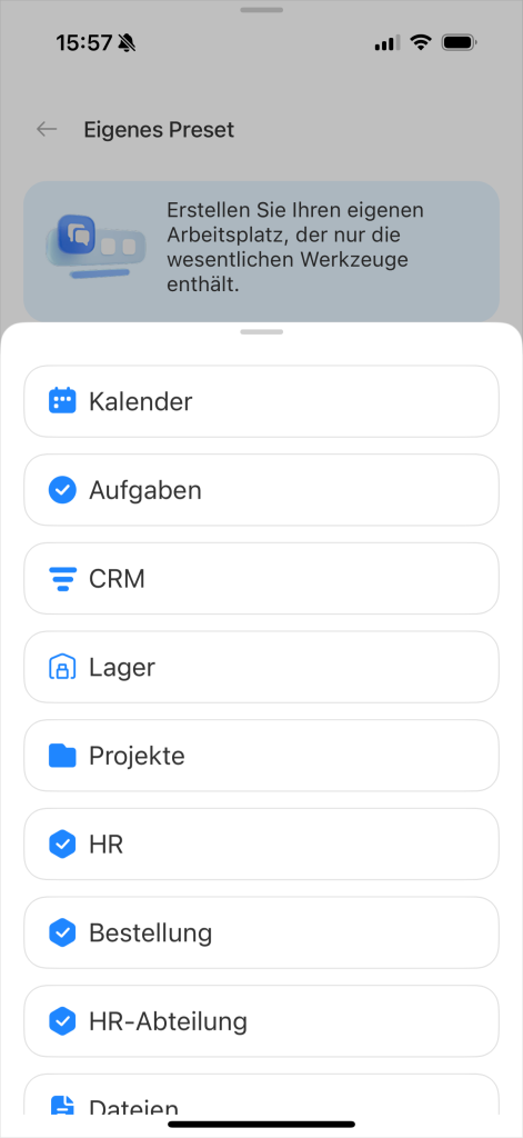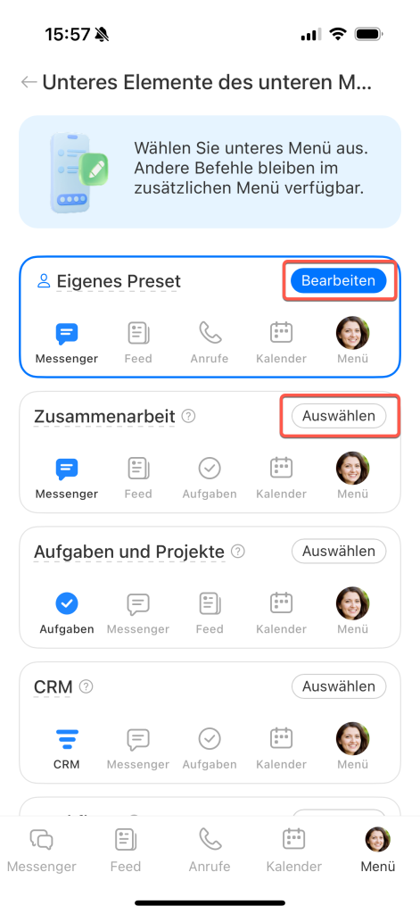 Sie können ein vordefiniertes Menü auswählen oder ein eigenes erstellen. Wenn Sie z. B. täglich Arbeitsfragen in Chats besprechen und Nachrichten im Feed verfolgen, wählen Sie das Menü Zusammenarbeit.