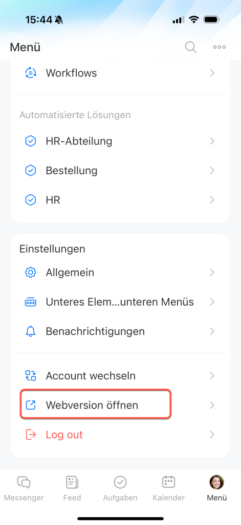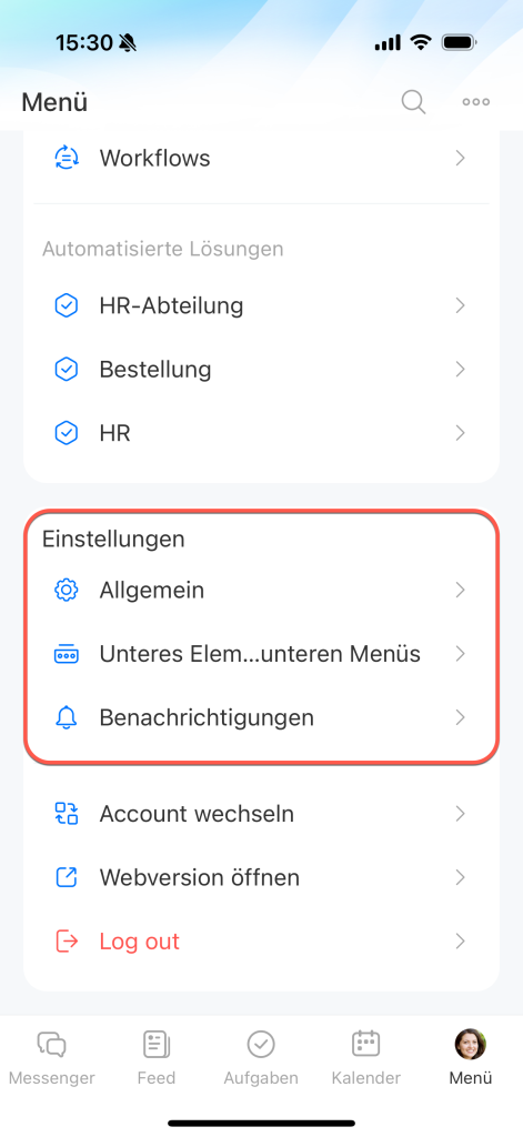 - Alle zusätzlichen Funktionen sind nun zentral im Menü verfügbar, das Sie per Klick auf Ihr Profilbild unten öffnen.