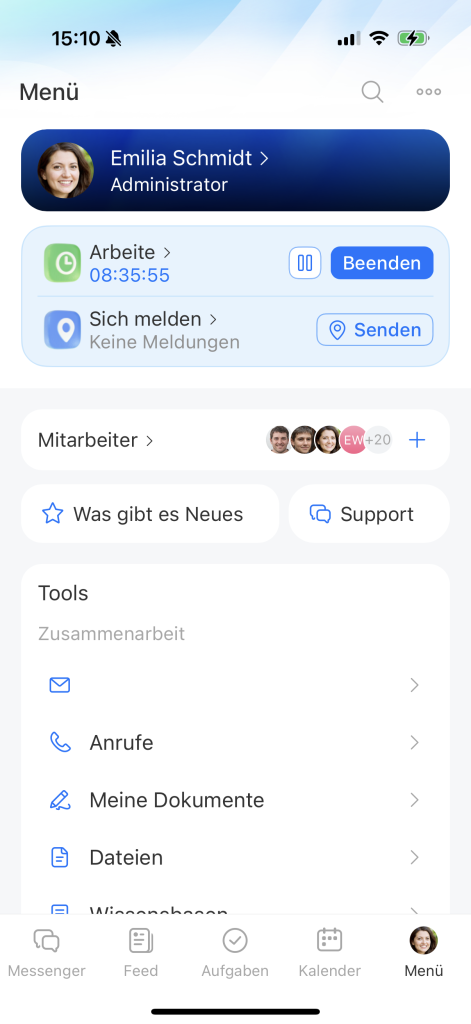 - In der App können Sie Arbeitszeit verwalten, sich online anmelden, Ihr Profil, Dokumente und Einstellungen öffnen sowie schnell zu einem anderen Account wechseln.