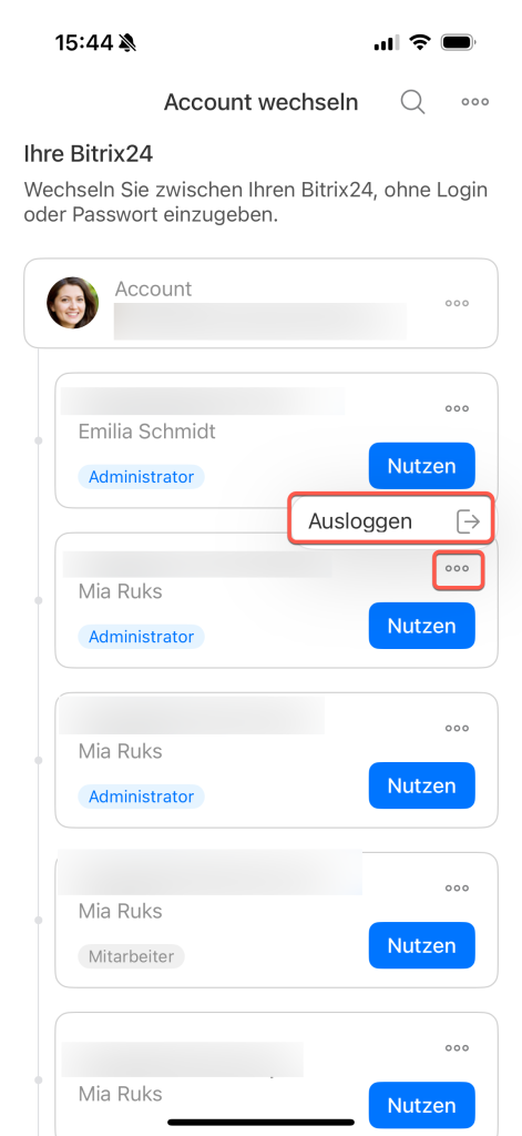 - sich aus Bitrix24 abmelden – klicken Sie auf Drei Punkte (...) > Ausloggen.