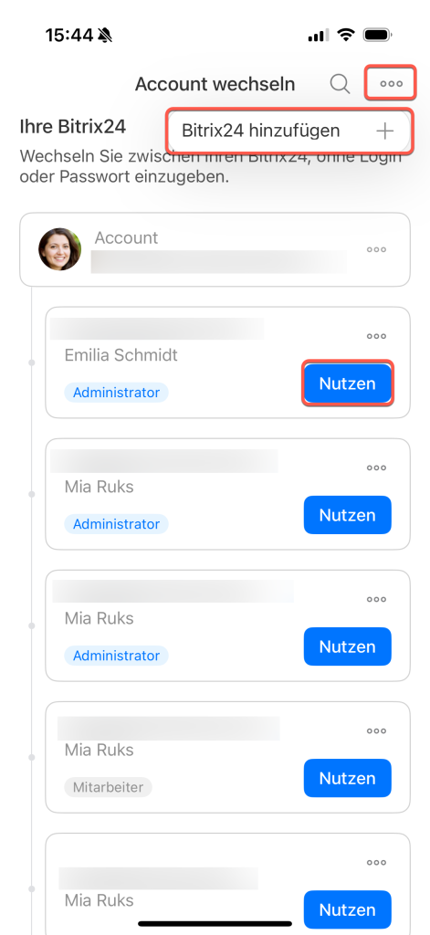 - einen anderen Bitrix24-Account öffnen – klicken Sie auf Nutzen,