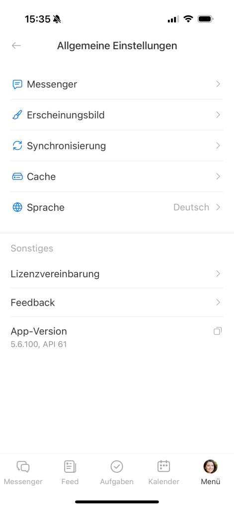 Allgemein. Hier können Sie den Messenger konfigurieren, Kontakte und Kalender synchronisieren, damit Termine aus Bitrix24 im Kalender Ihres Telefons angezeigt werden. So verpassen Sie keine wichtigen Ereignisse. Außerdem können Sie hier die Sprache der App, das Design-Thema und den Energiesparmodus anpassen.