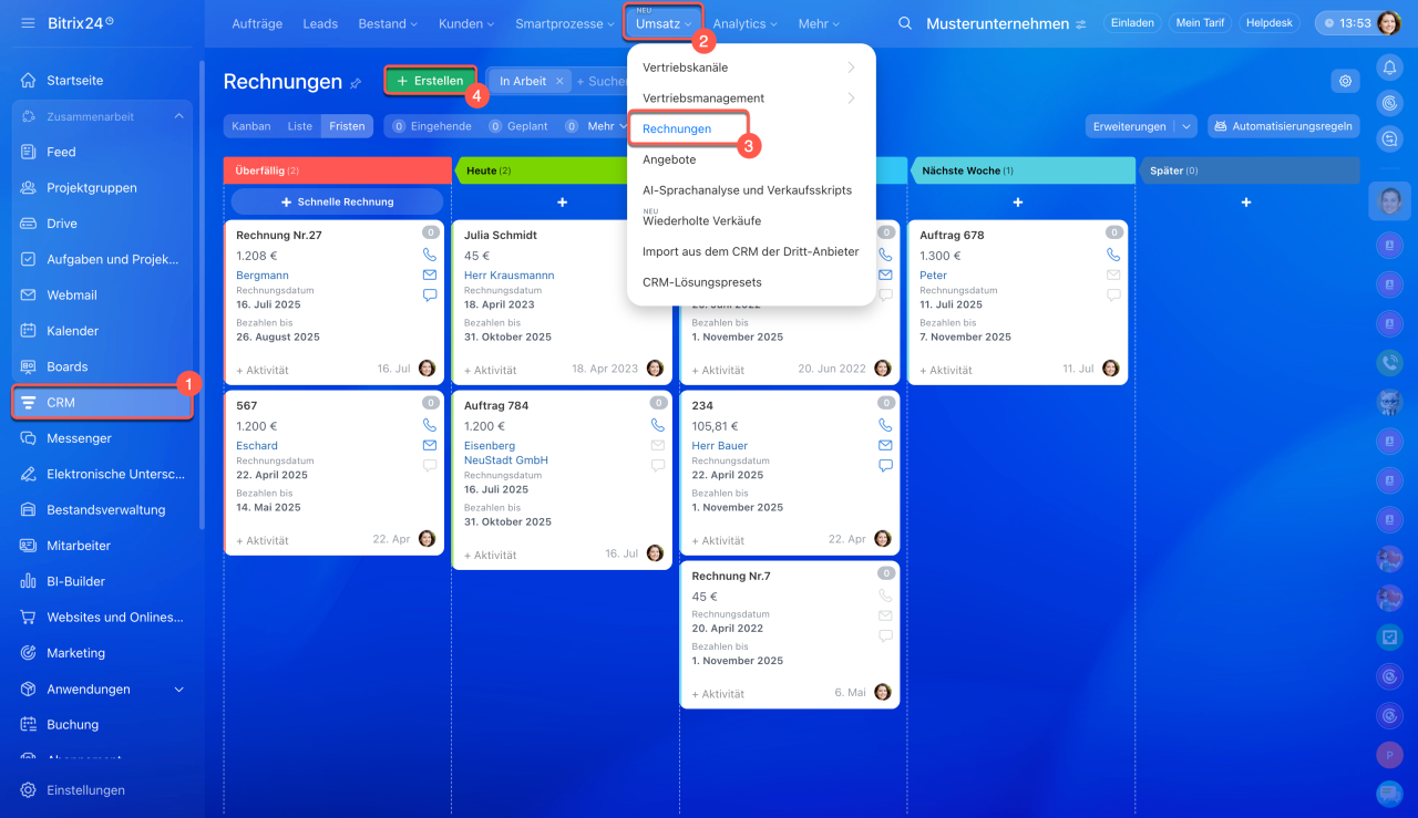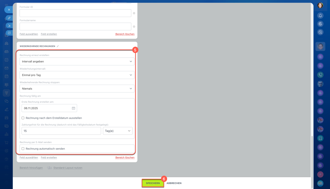 - Intervall angeben – CRM generiert Rechnungen automatisch nach dem festgelegten Zeitplan, z. B. wöchentlich oder monatlich.