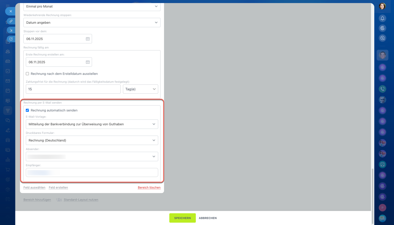 - Damit die wiederkehrende Rechnung automatisch per E-Mail an den Kunden gesendet wird, aktivieren Sie die Option Rechnung automatisch senden.
