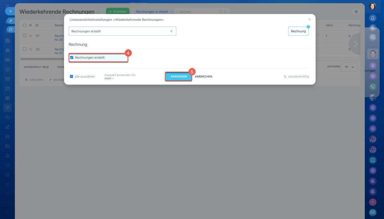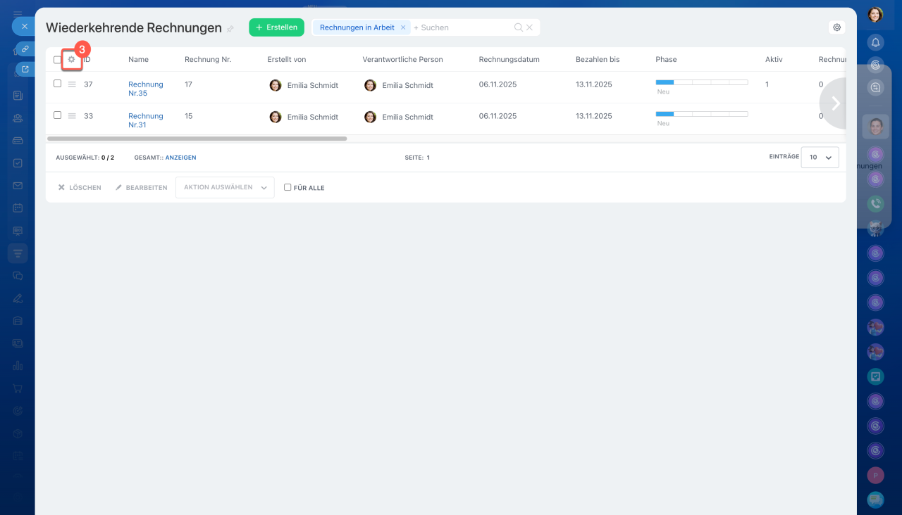 3–5. Falls benötigte Spalten nicht sichtbar sind, öffnen Sie über das Einstellungen-Symbol (⚙️) in der oberen rechten Ecke der Tabelle. Aktivieren Sie beispielsweise das Feld Erstellte Rechnungen, um die Gesamtanzahl der pro Vorlage generierten Rechnungen anzuzeigen.