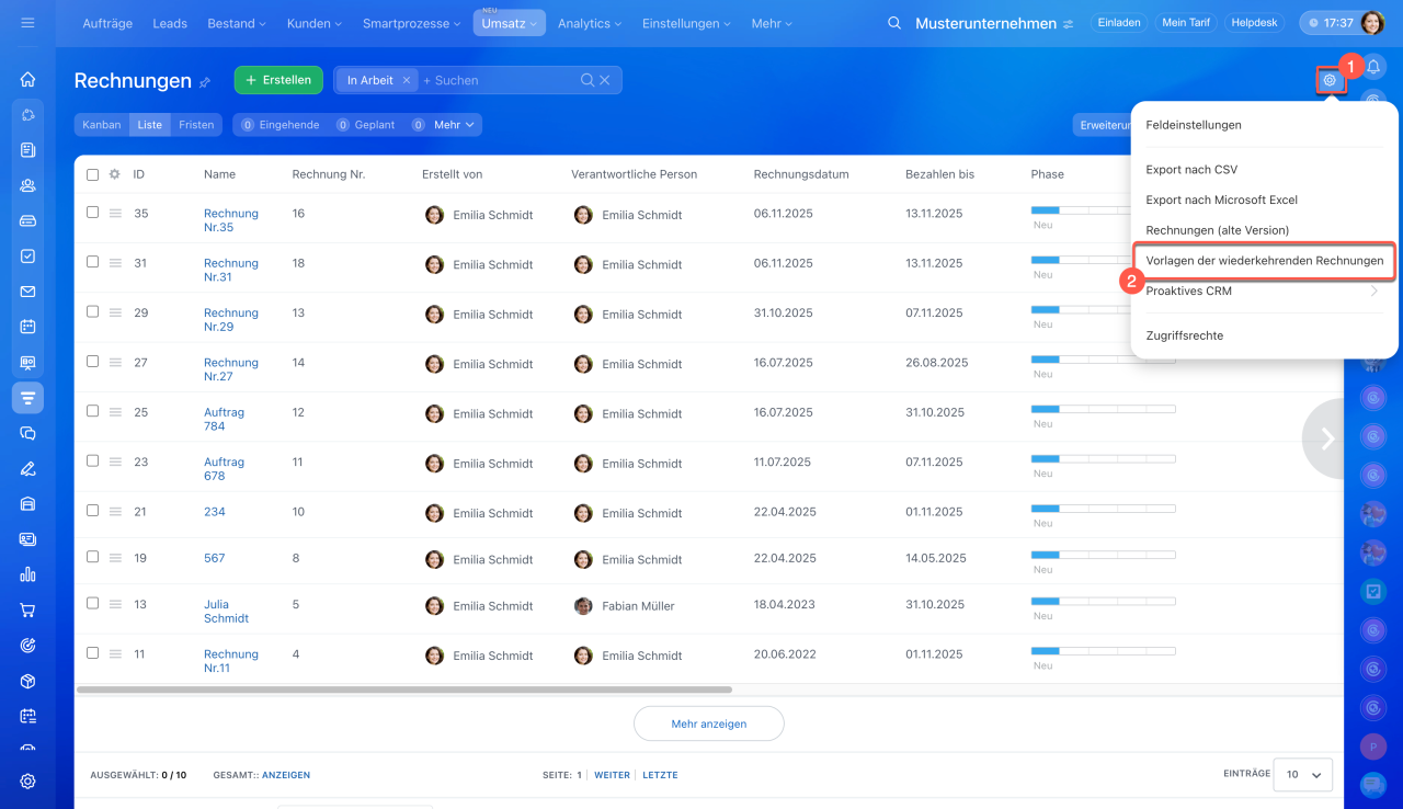 Nach der Erstellung wird die wiederkehrende Rechnung im CRM als Vorlage hinterlegt. Alle diese Vorlagen sind in einem separaten Bereich zusammengefasst. Dort können Sie erfahren, welche Rechnungen konfiguriert sind, welche Verantwortlichen zugeordnet wurden und wann neue Dokumente generiert werden sollen.