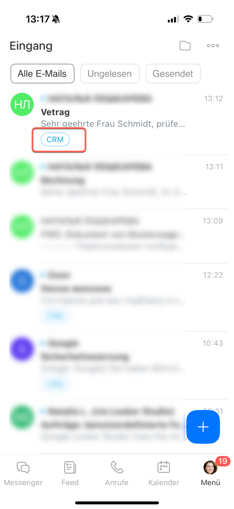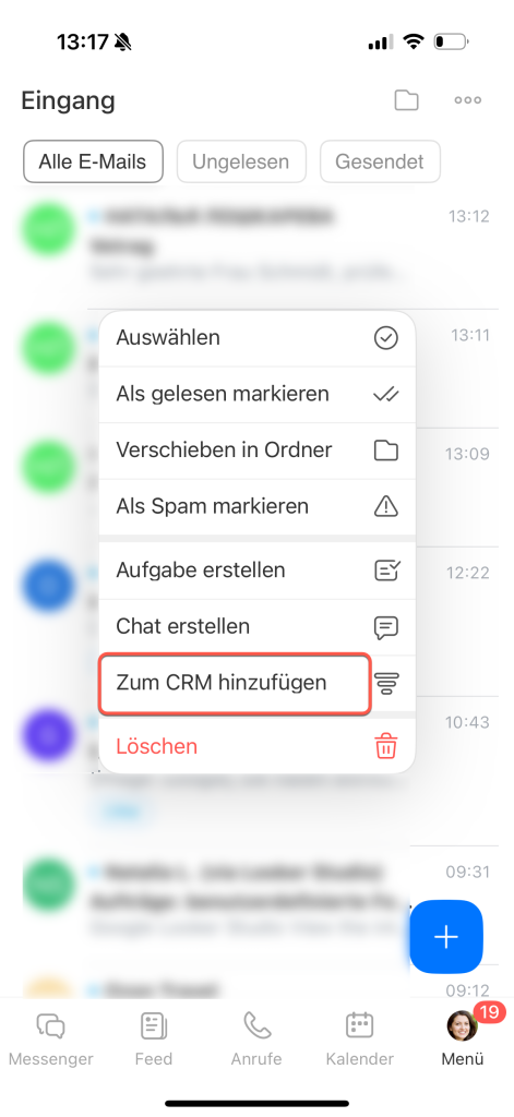 Halten Sie die gewünschte E-Mail gedrückt und wählen Sie eine Aktion aus – z. B. „Zum CRM hinzufügen“. Neben dieser E-Mail erscheint die Bezeichnung „CRM“, und Sie können schnell zum verknüpften Formular wechseln.