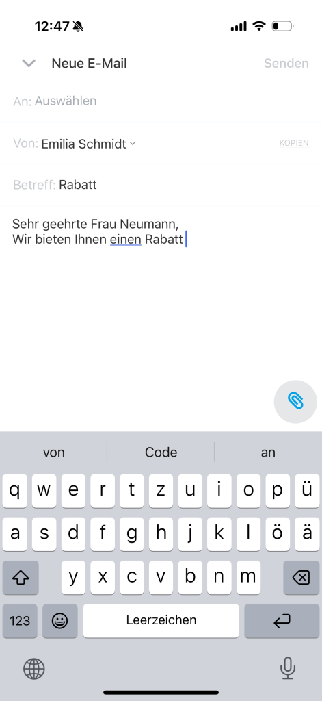 In der mobilen App von Bitrix24 können Sie Ihre Mailbox verbinden und damit genauso arbeiten wie am Computer. Sie können E-Mails lesen und versenden, Nachrichten an Kollegen weiterleiten, Aufgaben erstellen und diese mit dem CRM verknüpfen – und vieles mehr. Das ist besonders praktisch, wenn Sie häufig unterwegs sind und schnell auf E-Mails von Kunden, Kollegen oder Partnern antworten möchten.