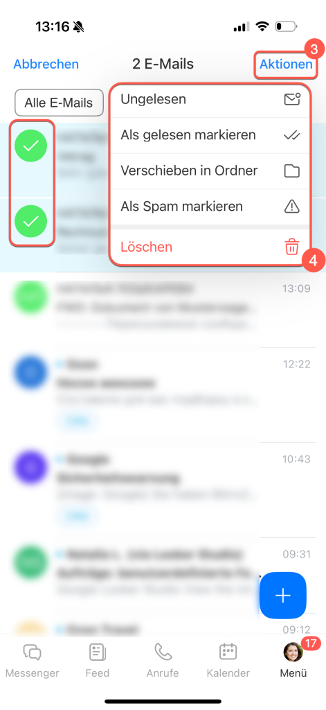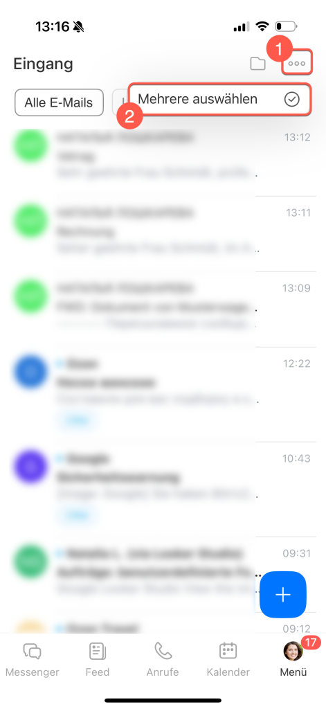 1–2. Klicken Sie auf Drei Punkte (...) > Mehrere auswählen. Wählen Sie die gewünschten E-Mails aus.