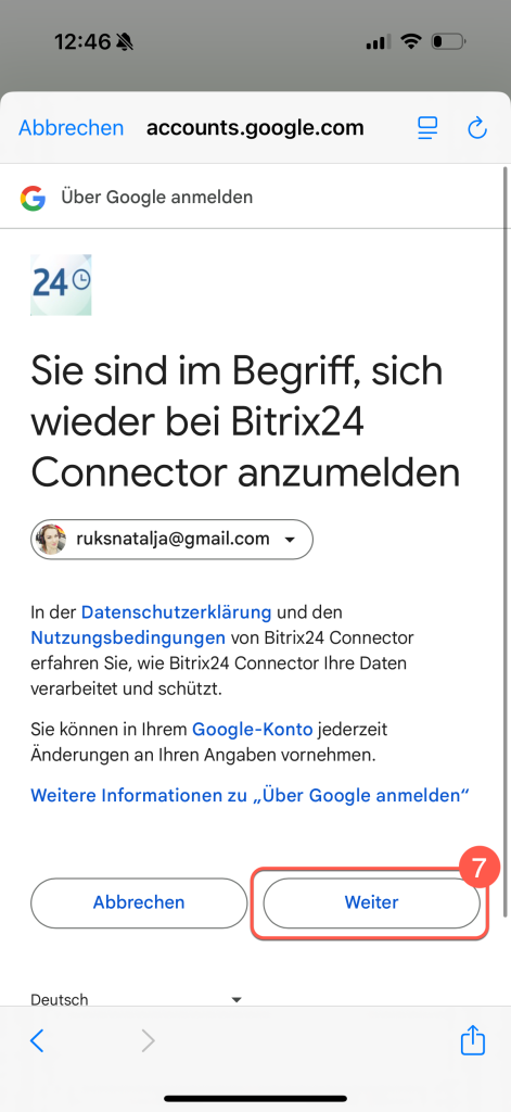 5. Klicken Sie auf Weiter – danach wird ein Anmeldefenster des ausgewählten Dienstes geöffnet.