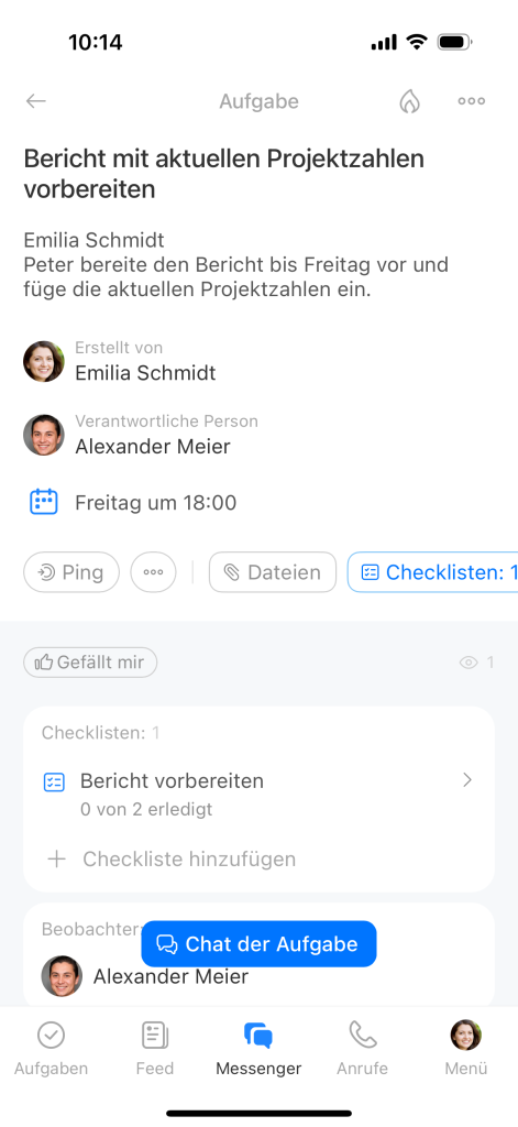 - Verantwortliche Person — wird kontextbezogen bestimmt: In einem Einzelchat wird der Empfänger Ihrer Nachricht als Verantwortlichen festgelegt, in einem Gruppenchat die Person, die in der Nachricht genannt wurde. Wenn die KI den Verantwortlichen nicht bestimmen kann, wird die Aufgabe dem Ersteller zugewiesen.