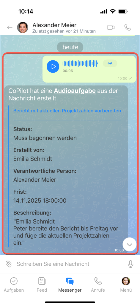 - Frist — wird aus der Sprach- oder Videonachricht entnommen. Wurde keine Frist genannt, wird standardmäßig ein Zeitraum von 5 Arbeitstagen gesetzt.