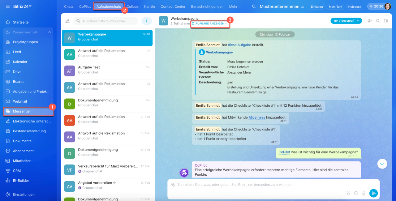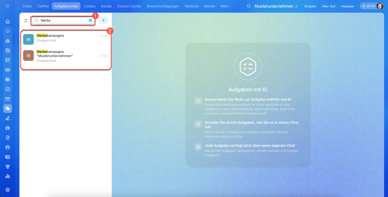 Wir haben einen neuen Bereich Aufgabenchats hinzugefügt – hier können Sie nicht nur Aufgaben verwalten, sondern auch direkt im Messenger-Format kommunizieren.