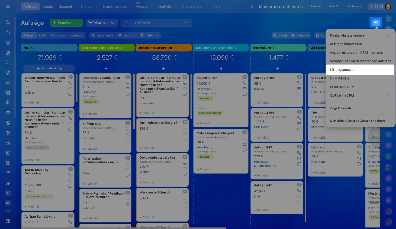 Wenn Sie noch ein Unternehmen eröffnet haben und die CRM-Einstellungen in den neuen Account übertragen möchten, wählen Sie die Option Lösungspresets. Exportieren Sie die aktuellen Einstellungen und übertragen Sie diese in den anderen Bitrix24-Account.