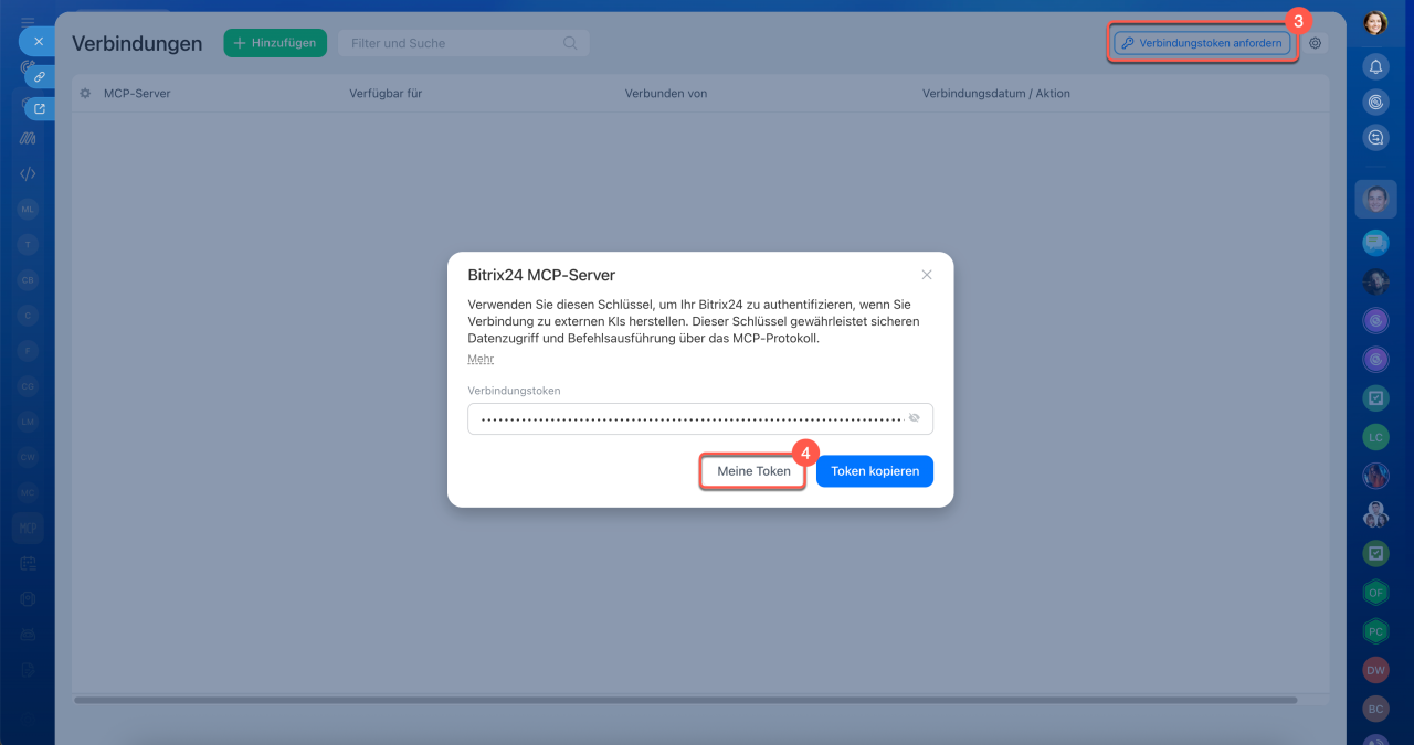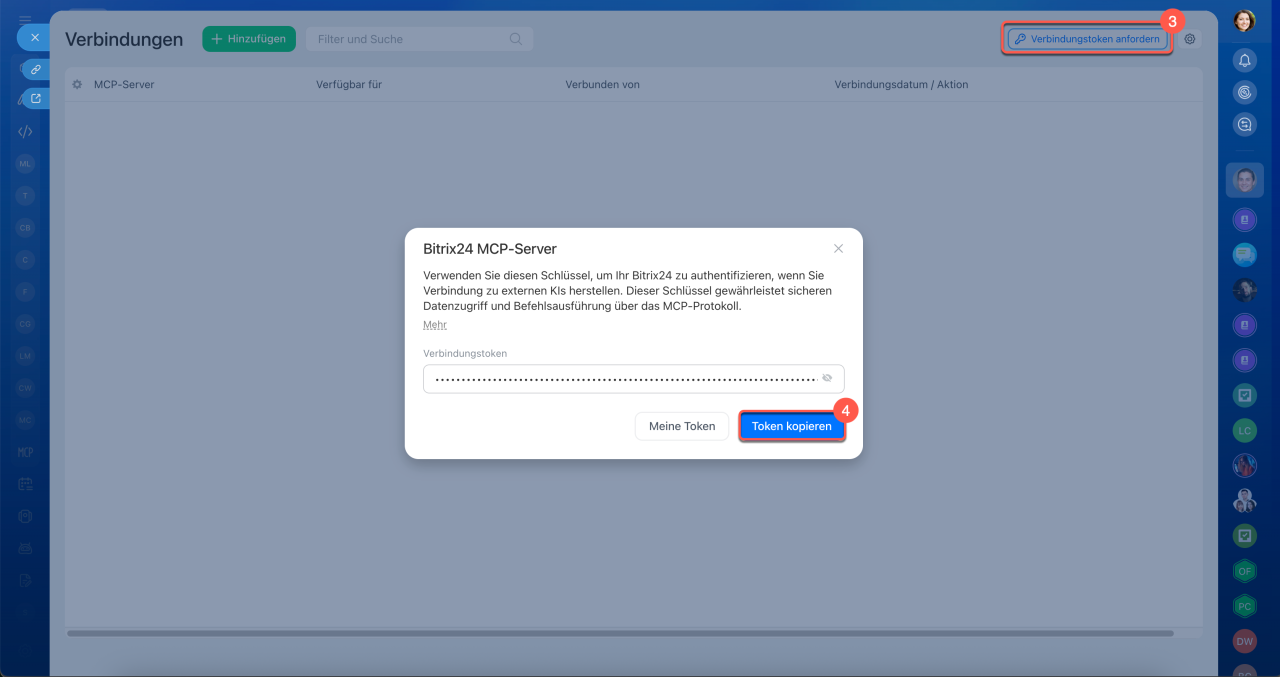 https://mcp.bitrix24.com/mcp/. - Um die Integration mit einem Token einzurichten, klicken Sie auf Anwendungen > MCP-Verbindungen > Verbindungstoken anfordern > Token kopieren und geben Sie ihn bei der Verbindung an.