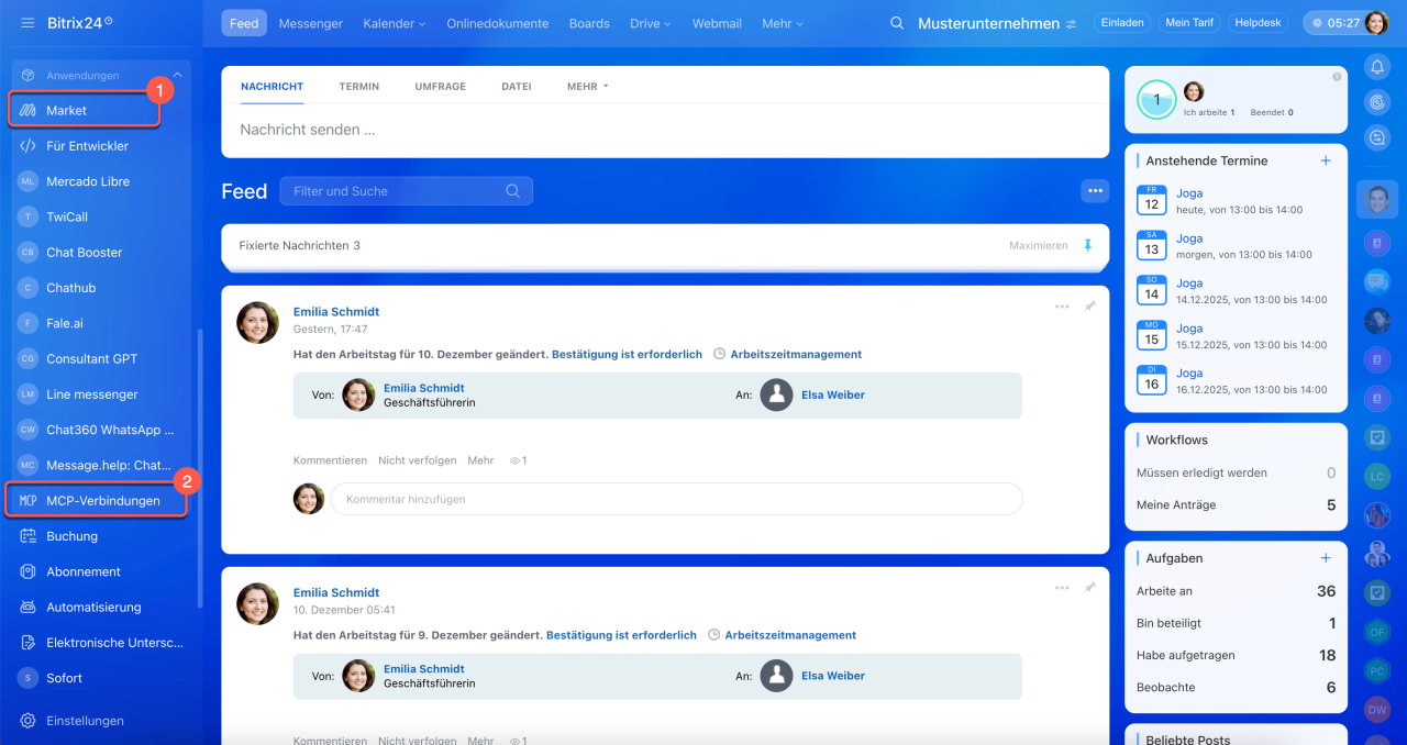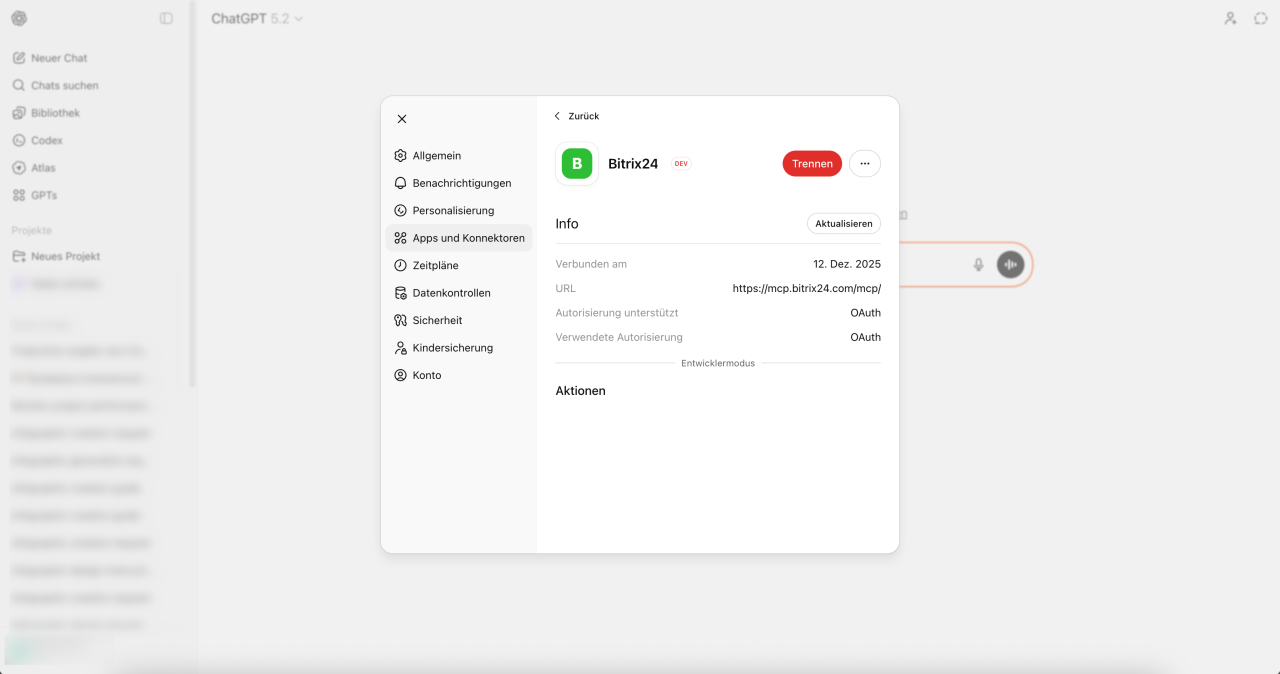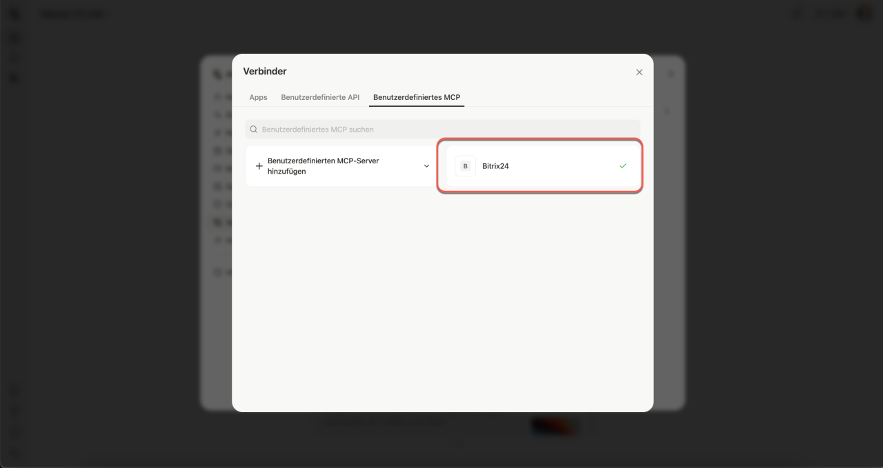 - Mit dem MCP-Server können Sie Bitrix24 mit externen KI-Systemen verbinden, die Sie bereits in Ihrem Arbeitsalltag nutzen – wie zum Beispiel ChatGPT. Das ist besonders praktisch, wenn Sie CRM, Aufgaben und andere Tools direkt aus dem Chat mit Ihrem virtuellen Assistenten steuern möchten.