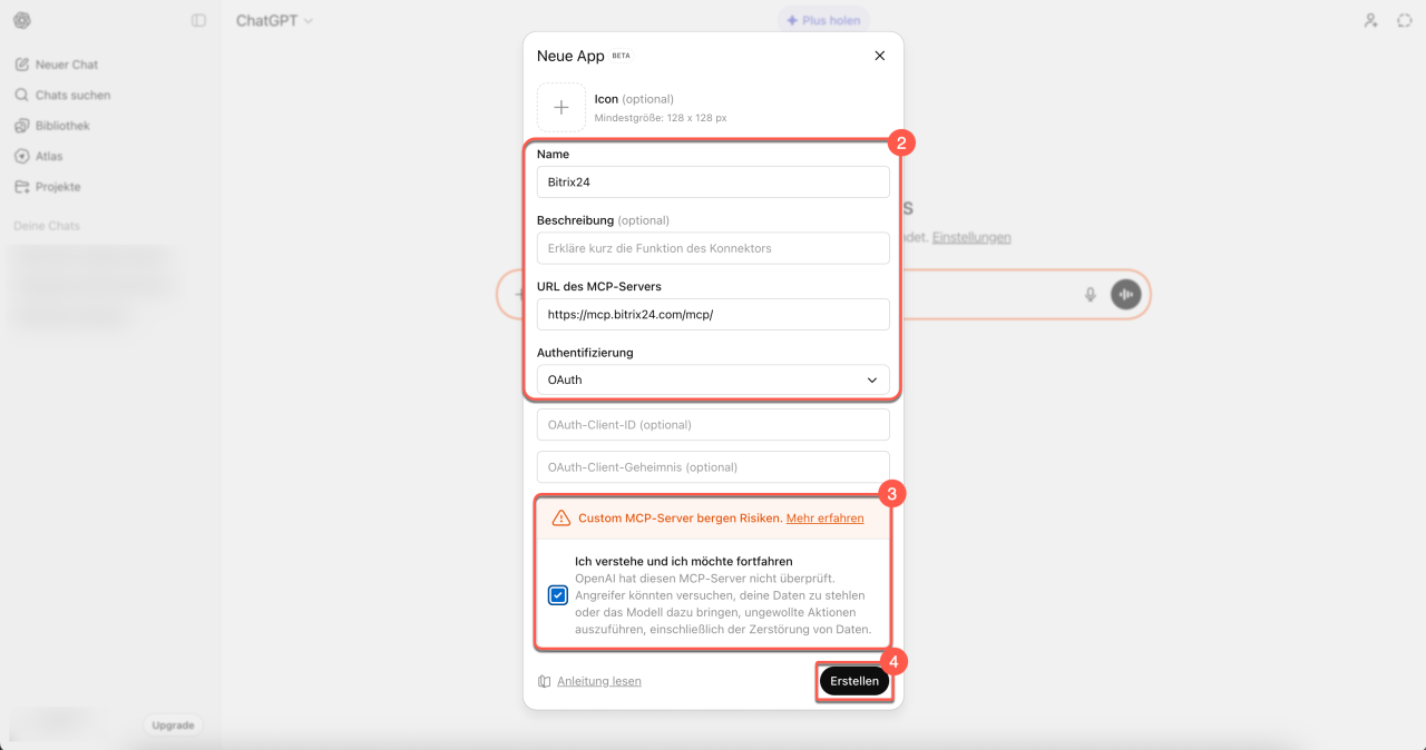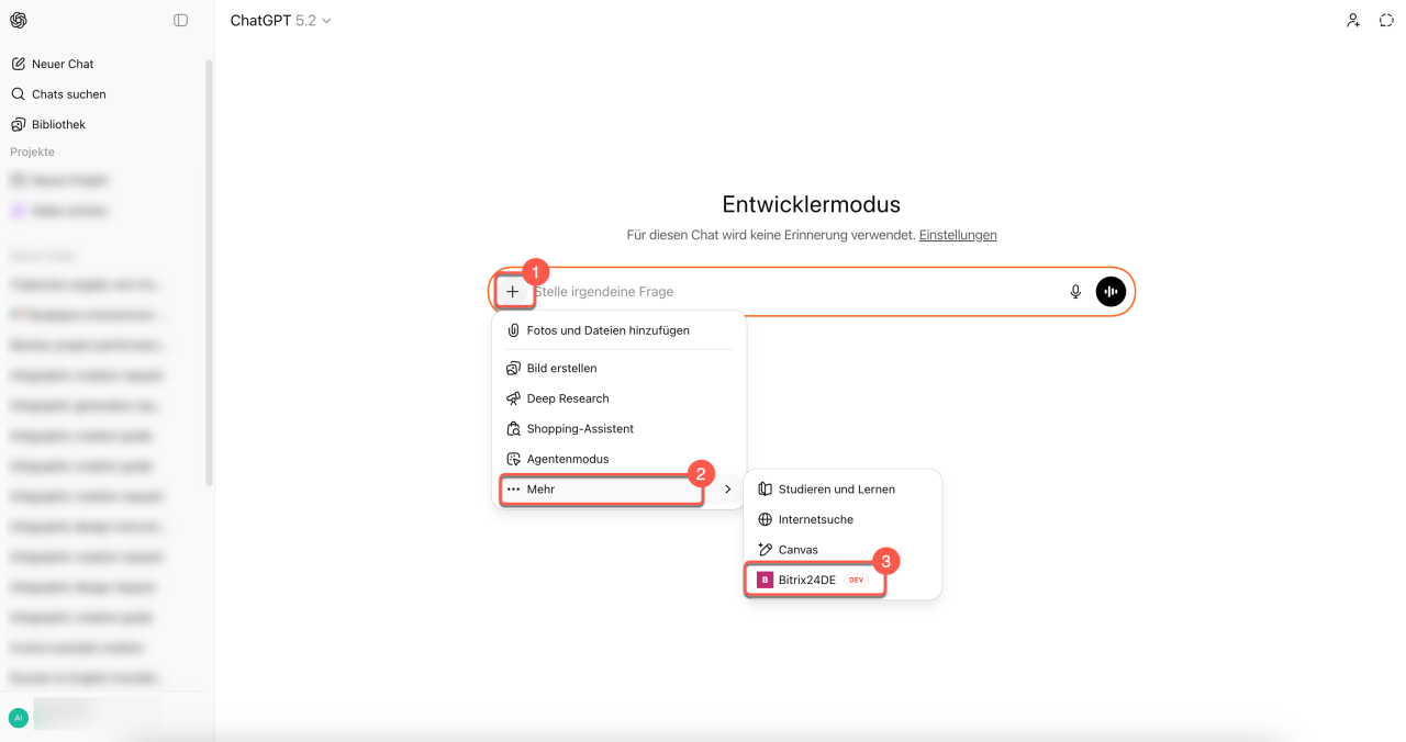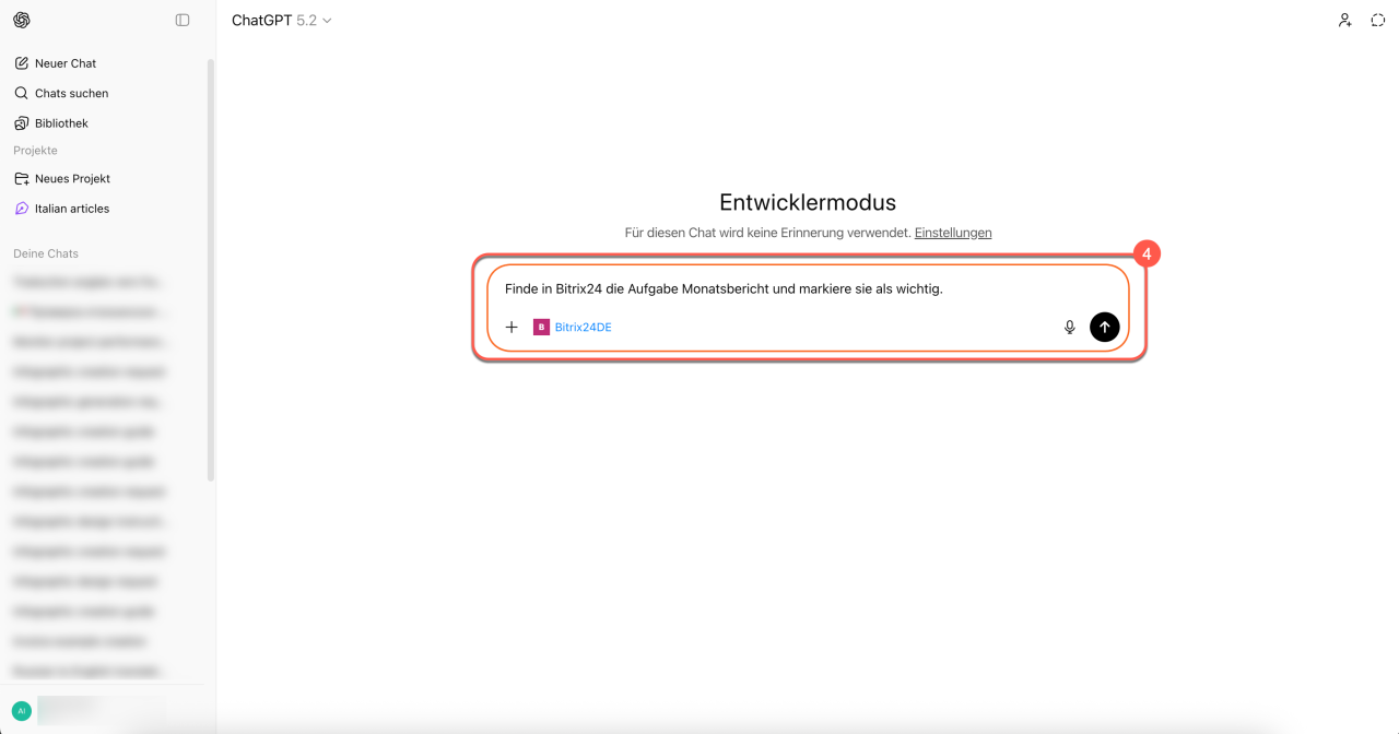 Mit dem MCP-Server können Sie Bitrix24 mit externen KI-Systemen verbinden, die Sie schon in Ihrem Arbeitsalltag nutzen – wie zum Beispiel ChatGPT. Das ist besonders praktisch, wenn Sie CRM, Aufgaben und andere Tools direkt aus dem Chat mit Ihrem virtuellen Assistenten steuern möchten.
