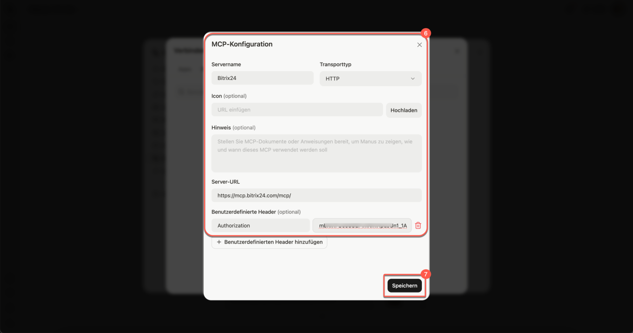 https://mcp.bitrix24.com/mcp/. - Benutzerdefinierte Header — lassen Sie den Wert
