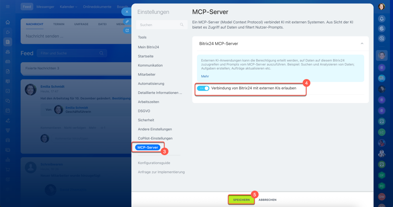4. Aktivieren Sie im Block Bitrix24 MCP-Server die Option Verbindung von Bitrix24 mit externen KIs erlauben.