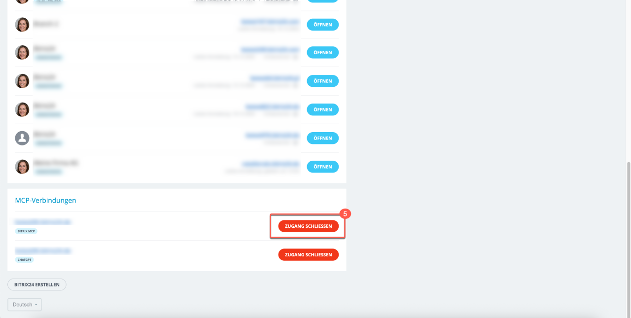 5–6. Finden Sie im Block MCP-Verbindungen die Integration, die Sie deaktivieren möchten und klicken Sie auf Zugang schließen.