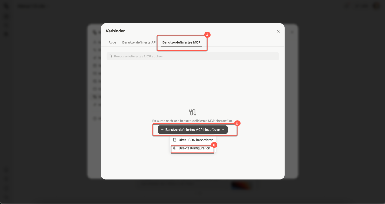 4-5. Klicken Sie auf Benutzerdefiniertes MCP > Benutzerdefiniertes MCP hinzufügen > Direkte Konfiguration.