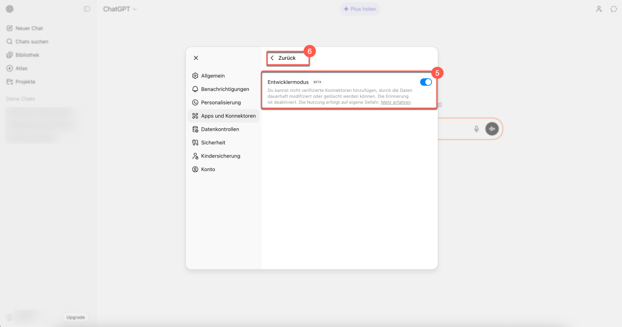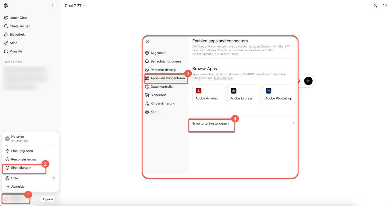 2–4. Gehen Sie zu Einstellungen (⚙️) > Apps und Konnektoren > Erweiterte Einstellungen.