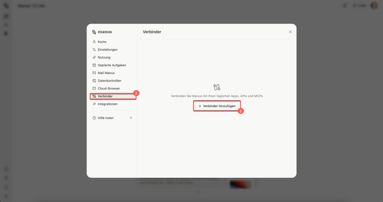 1–2. Öffnen Sie den Bereich Anwendungen > MCP-Verbindungen.
