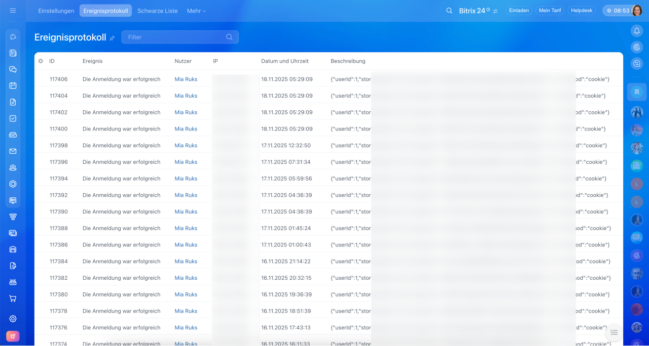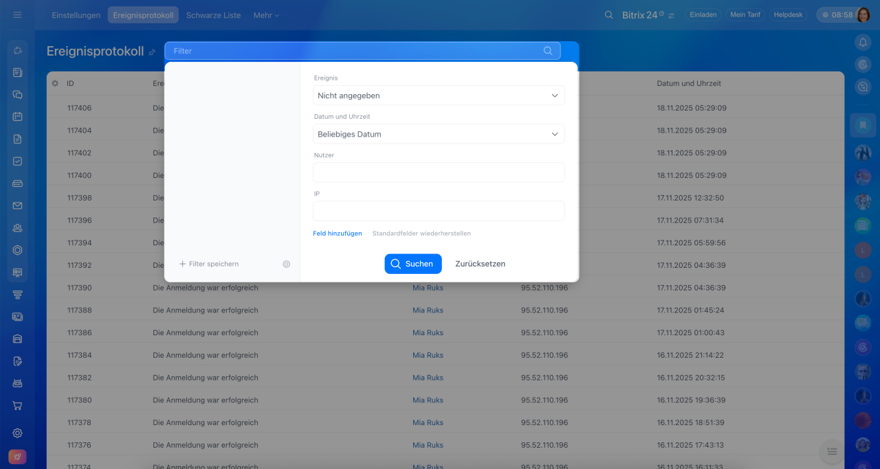 Hier finden Sie Informationen, wer und von welchen IP-Adressen sich in Bitrix24 eingeloggt hat.