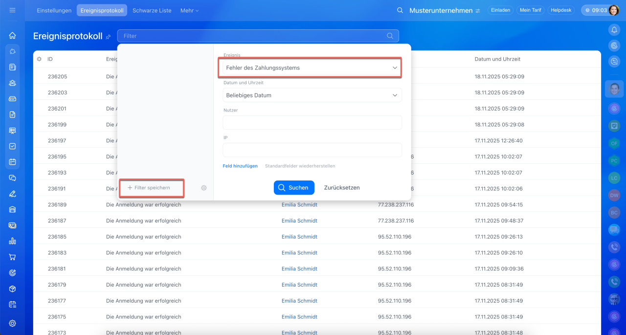 Mit dem Filter können Sie die Daten nach bestimmten Parametern suchen: Ereignis, Datum, Nutzer oder IP.