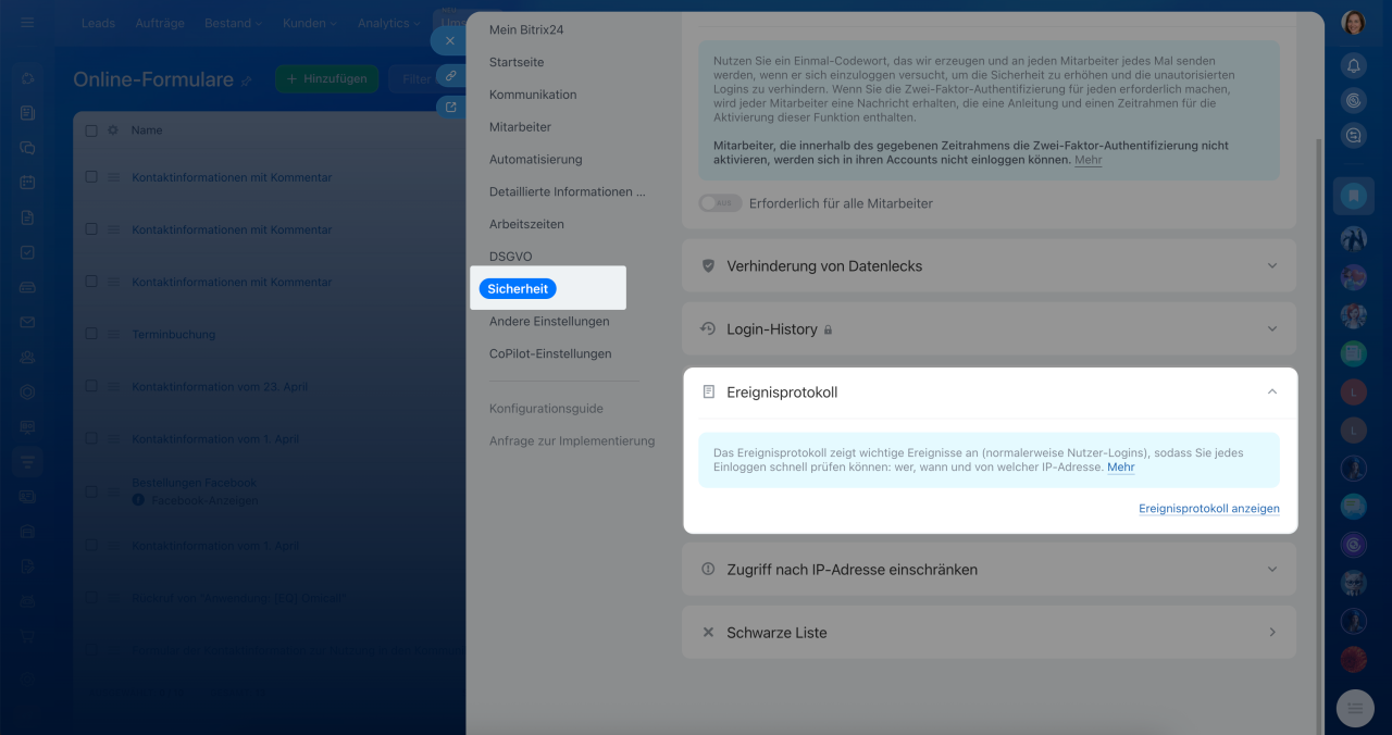 In Bitrix24 können Sie genau nachverfolgen, welcher Mitarbeiter sich wann und von welcher IP-Adresse aus angemeldet hat. Diese wichtige Sicherheitsfunktion befindet sich im Ereignisprotokoll und hilft dabei, verdächtige Aktivitäten frühzeitig zu erkennen und die Datensicherheit Ihres Unternehmens zu erhöhen.