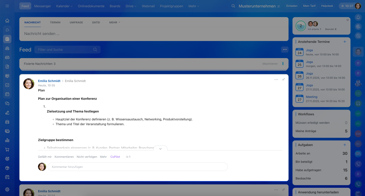 Externe Nutzer von Bitrix24 – wie Kunden, Partner oder Lieferanten – haben die Möglichkeit, Nachrichten im Feed zu veröffentlichen. Wenn Sie beispielsweise eine Konferenz organisieren, können Sie die zuständige Agentur bitten, den Plan direkt in den Feed zu stellen, damit Sie ihn mit Ihren Kollegen besprechen können.