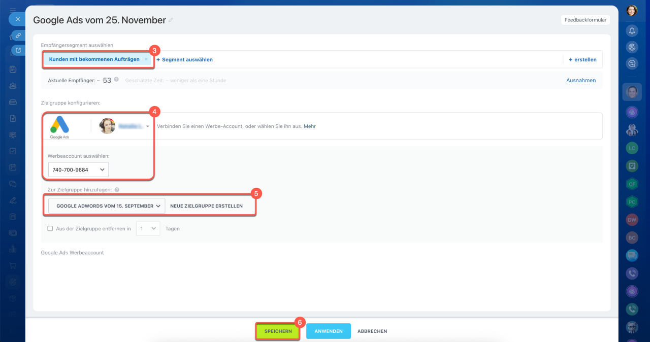 1. Sie wählen ein Kundensegment in Bitrix24 aus und verknüpfen Sie es mit einer Zielgruppe im Werbeservice.