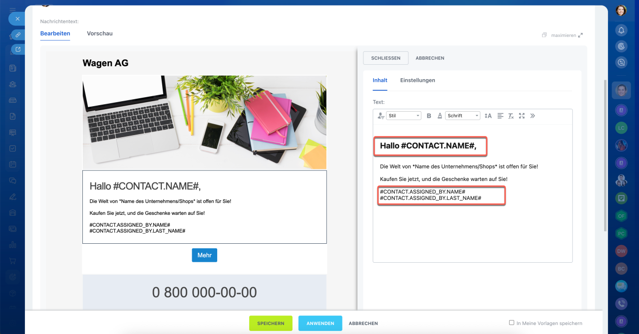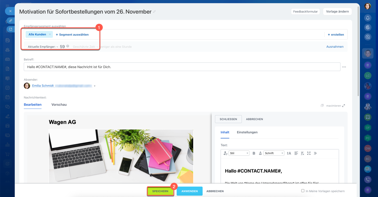 Sie können Ihren Kunden beispielsweise einen persönlichen Rabatt mitteilen, indem Sie ihren Namen sowie den Namen des zuständigen Mitarbeiters in die E-Mail einfügen. Bearbeiten Sie einfach den Nachrichtentext und setzen Sie die zuvor kopierten Platzhalter an den gewünschten Stellen ein.