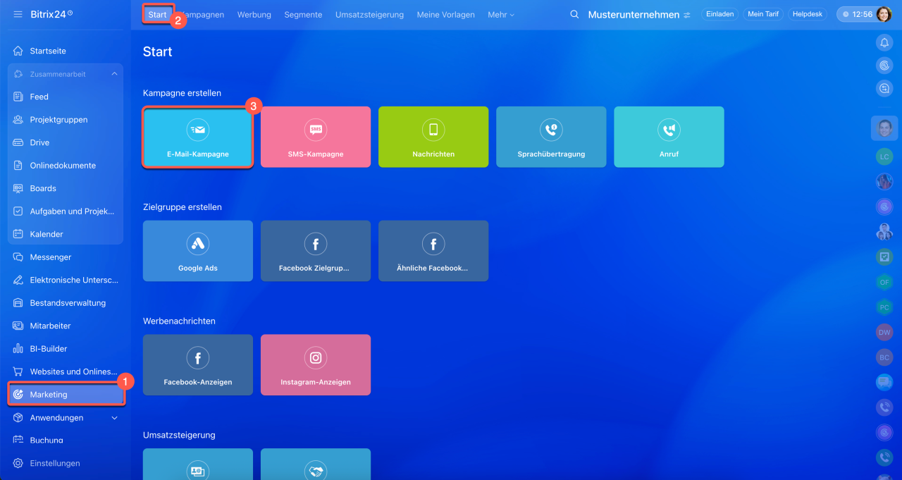 Um eine personalisierte E-Mail-Kampagne zu erstellen, öffnen Sie den Bereich Marketing > Start > E-Mail-Kampagne und legen Sie eine neue Kampagne an.