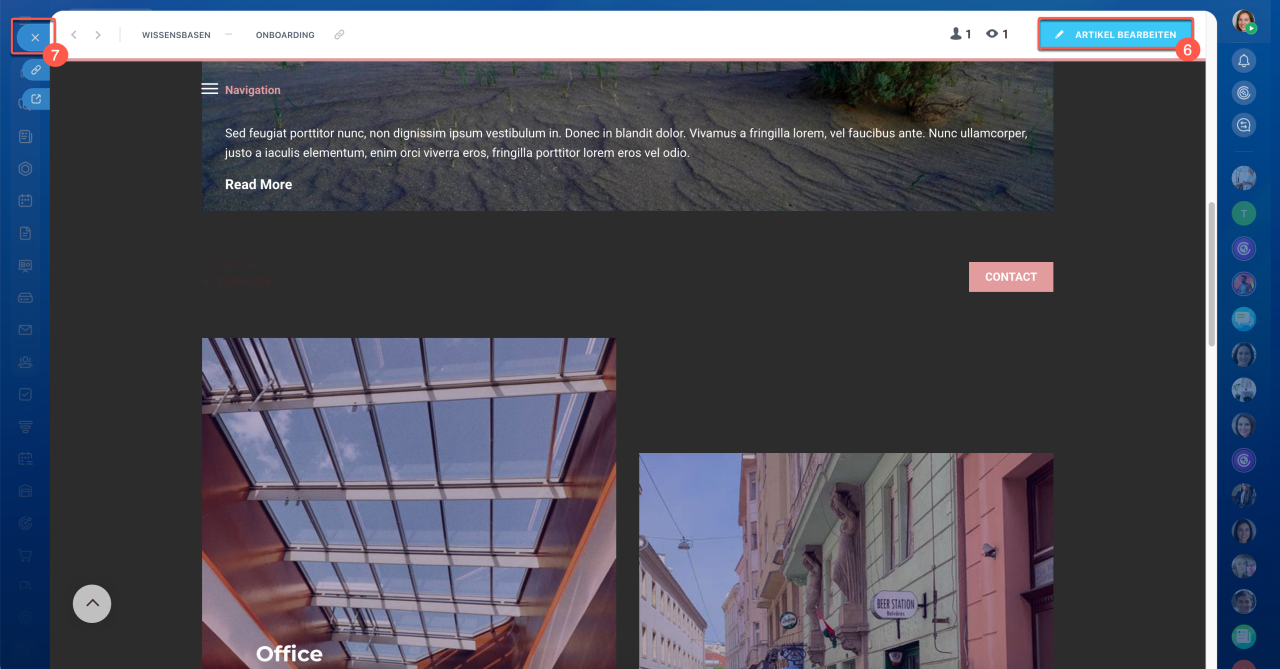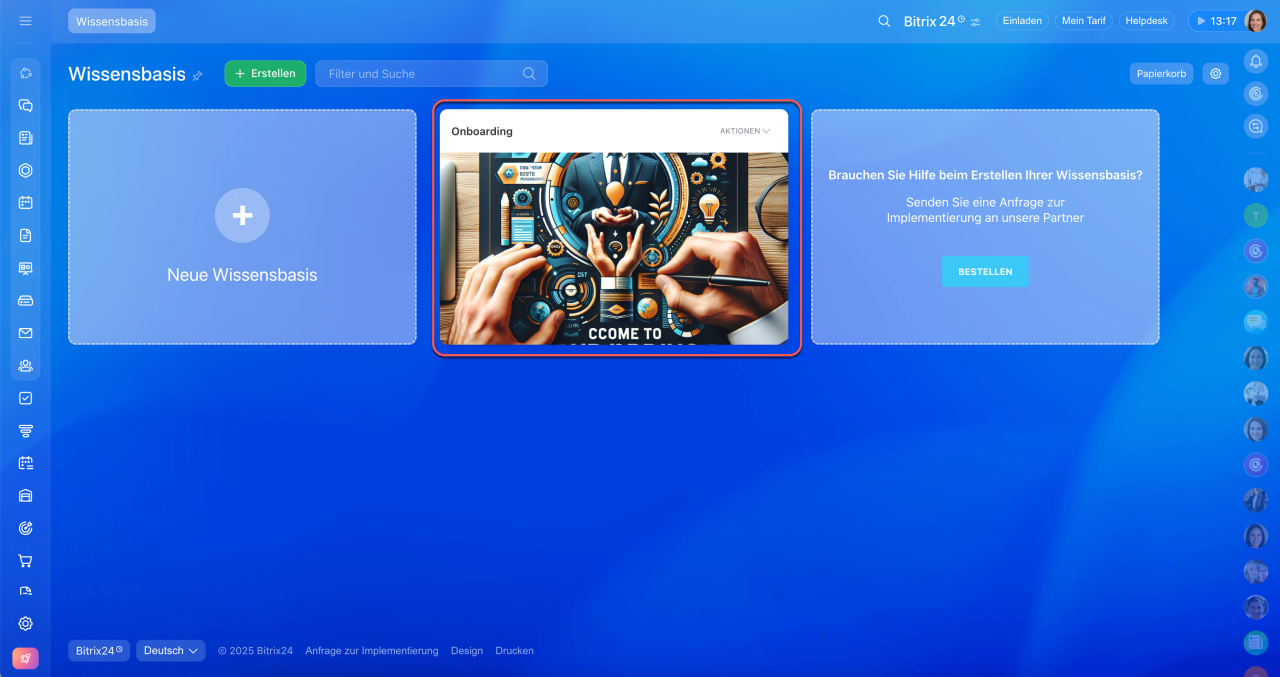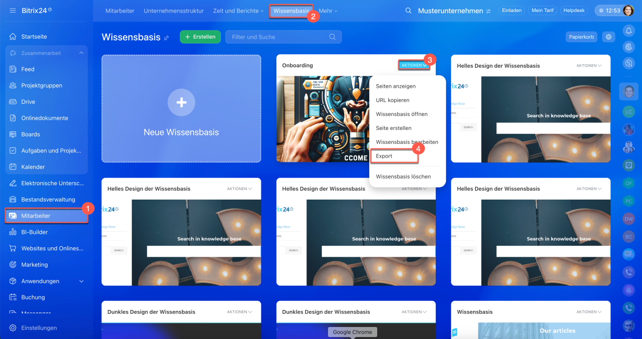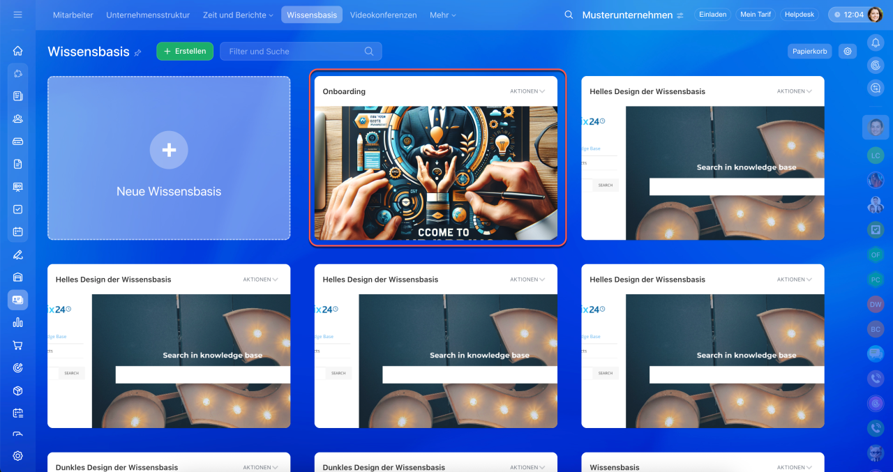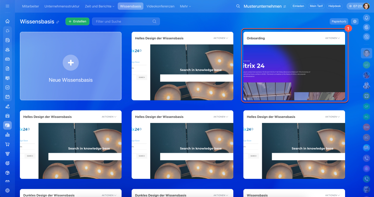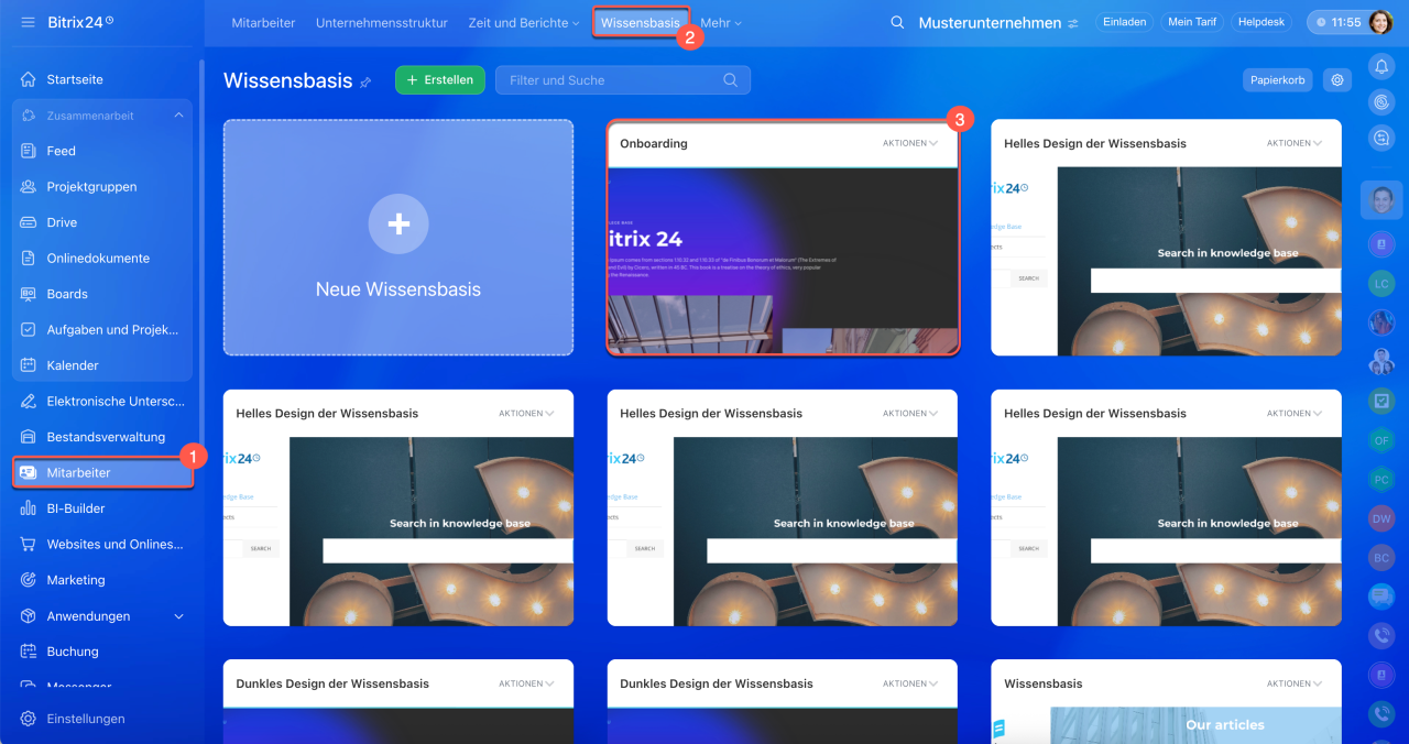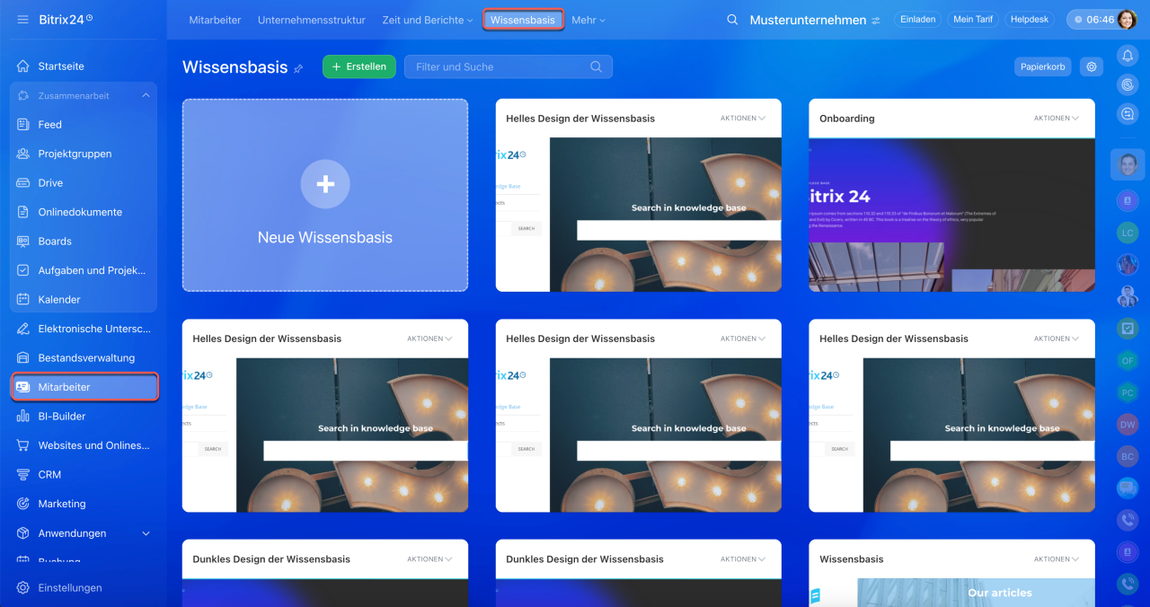 - Wissensbasis des Unternehmens – öffnen Sie den Bereich Mitarbeiter > Wissensbasis.