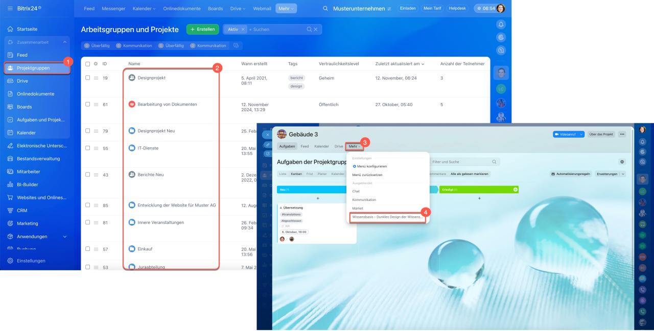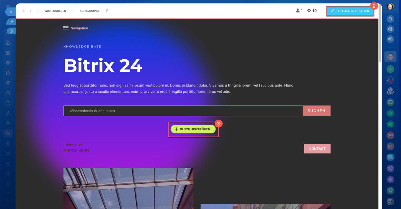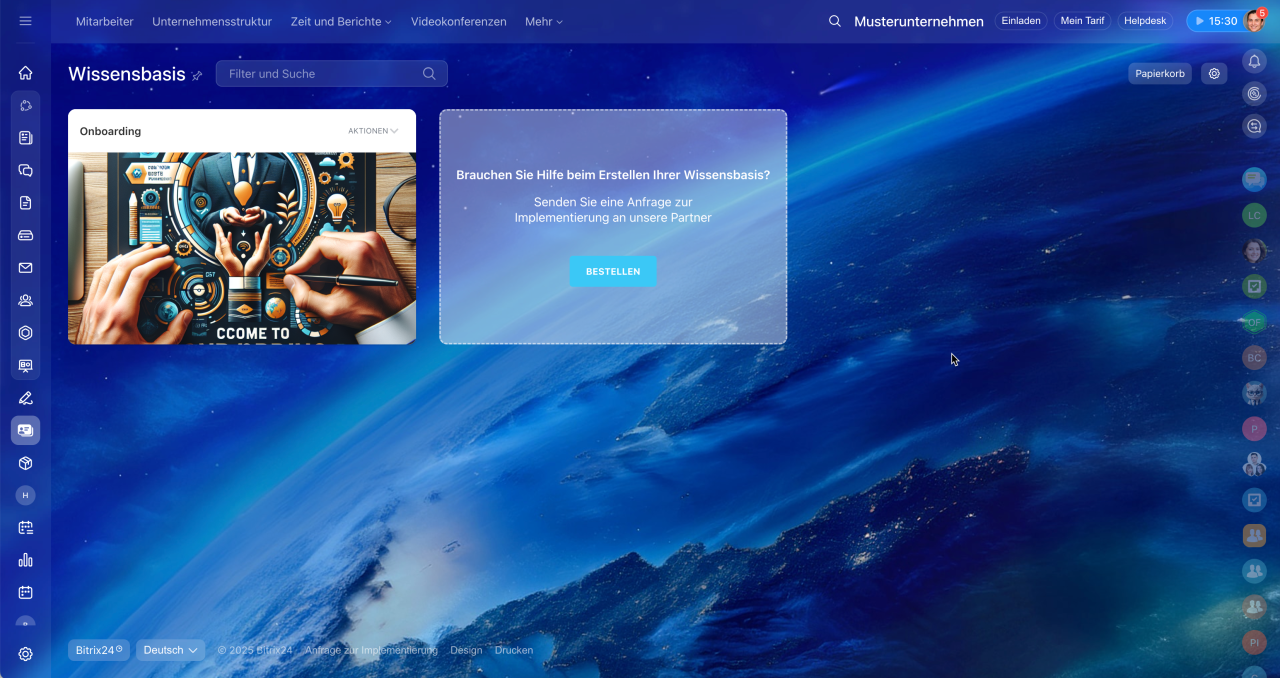 In Bitrix24 können Sie eine Wissensbasis erstellen – ein praktisches Online-Handbuch mit einfacher Navigation und integrierter Suchfunktion. Diese eignet sich ideal, um Anleitungen, Richtlinien und andere hilfreiche Materialien zu speichern. Ein schneller Zugriff auf relevante Informationen unterstützt neue Mitarbeiter bei der Einarbeitung und sorgt dafür, dass das Team einheitlich und effizient arbeitet.