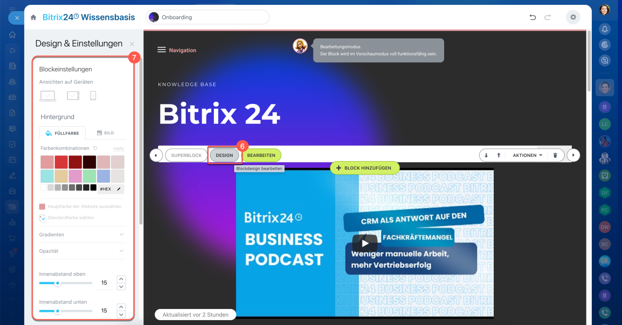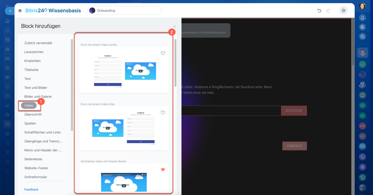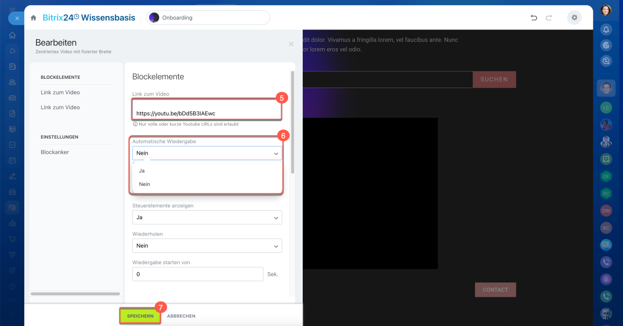In die Wissensbasis können Videos von YouTube oder aus dem Bitrix24 Drive eingebunden werden. Durch Produktübersichten, Schulungsvideos und andere visuelle Inhalte wird die Wissensbasis anschaulicher und benutzerfreundlicher.