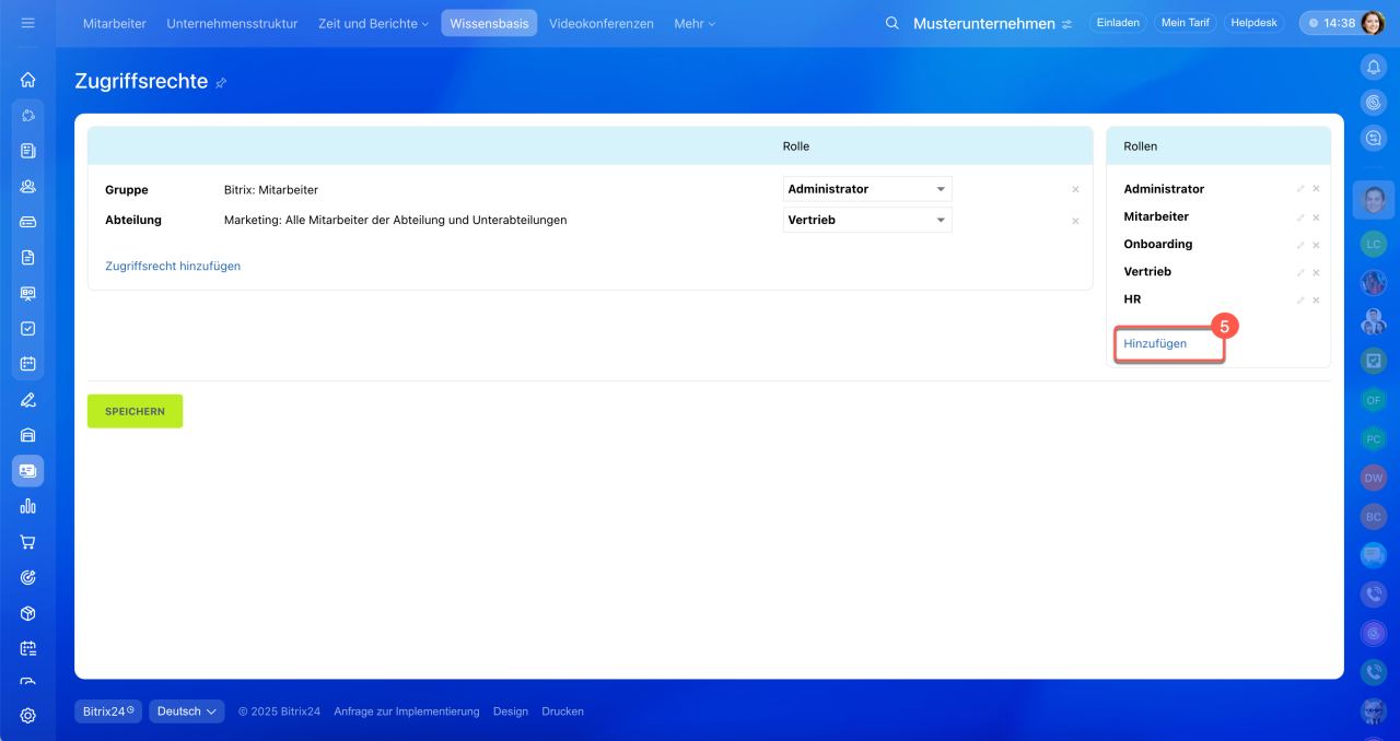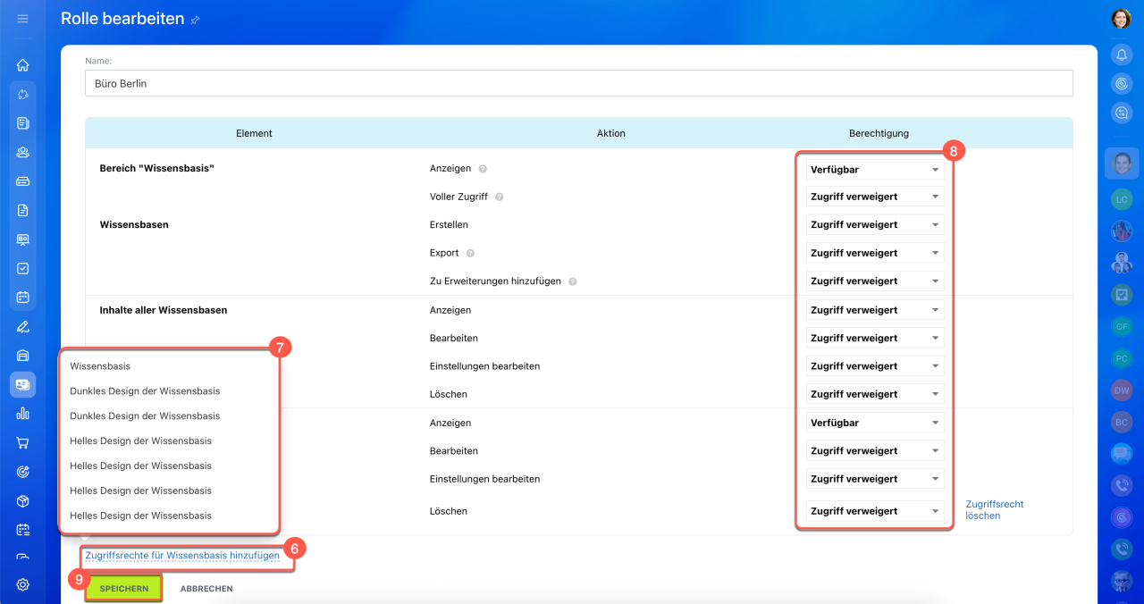 In Bitrix24 können Rollen mit unterschiedlichen Zugriffsrechten für Wissensbasen erstellt und Mitarbeitern, Gruppen oder Abteilungen zugewiesen werden. Nutzer sehen nur die Wissensbasen, die ihrer Rolle zugeordnet sind. Wenn eine Rolle keinen Zugriff auf eine bestimmte Wissensbasis gewährt, bleibt diese für den Mitarbeiter unsichtbar.
