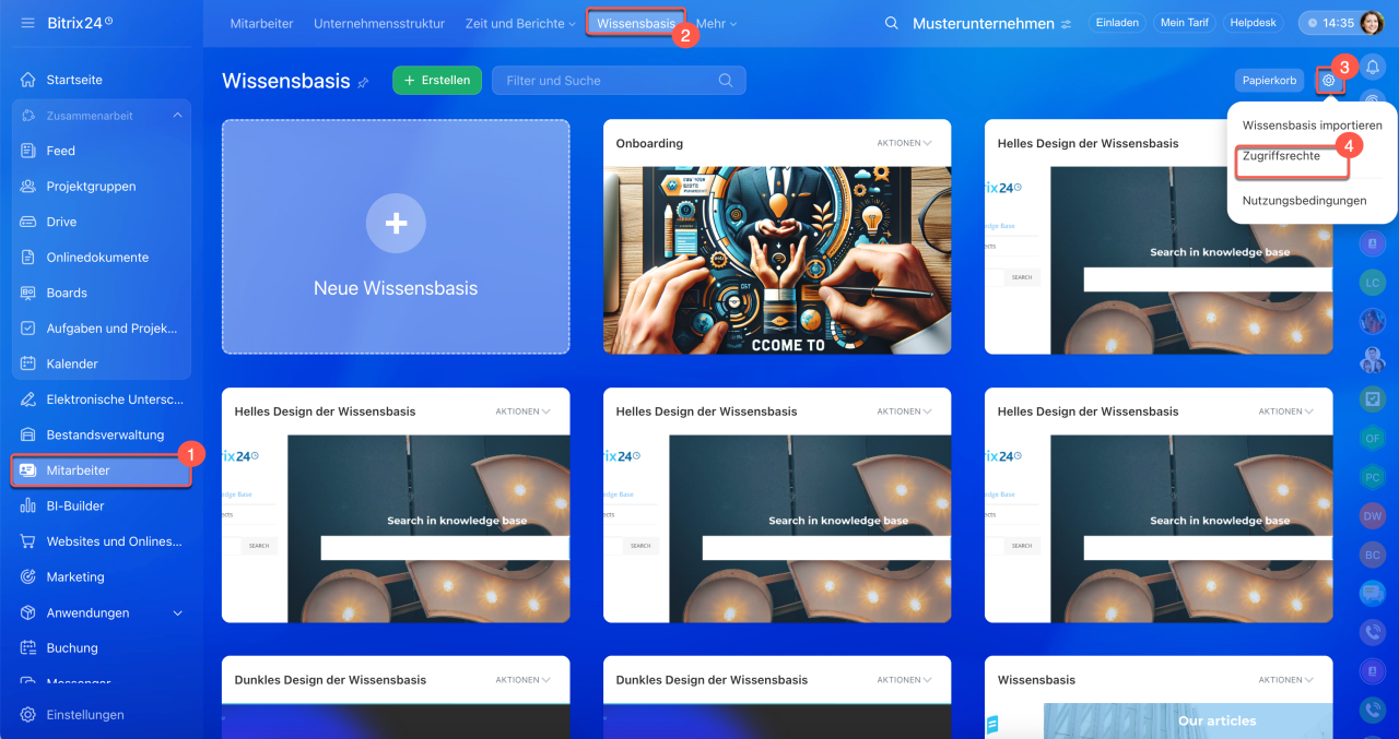 1–4. Öffnen Sie den Bereich Mitarbeiter > Wissensbasis > Einstellungen (⚙️) > Zugriffsrechte.
