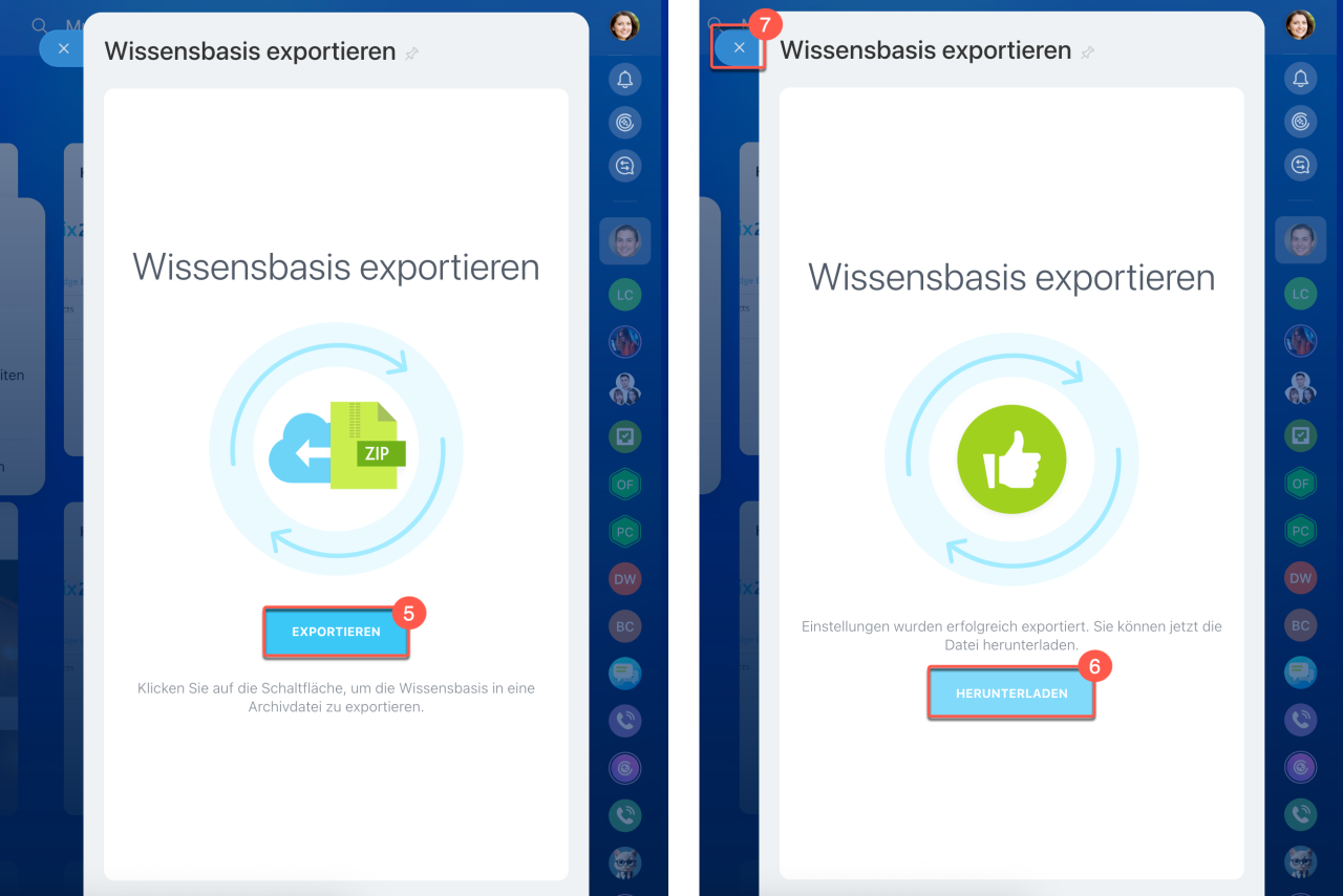 3-6.Wählen Sie die Wissensbasis aus, die Sie kopieren möchten. Klicken Sie auf Aktionen > Export > Exportieren > Herunterladen.