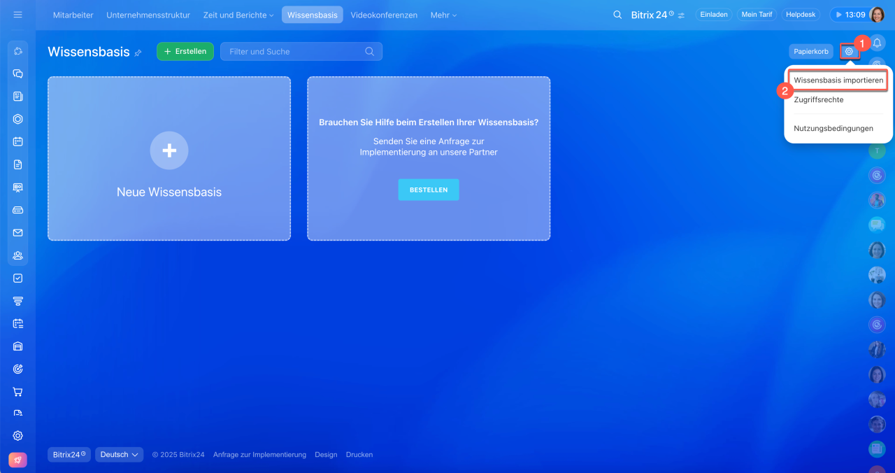 Der Export und Import von Wissensbasen kann von Bitrix24-Administratoren sowie von Mitarbeitern mit vollem Zugriff auf den Bereich Wissensbasis durchgeführt werden.
