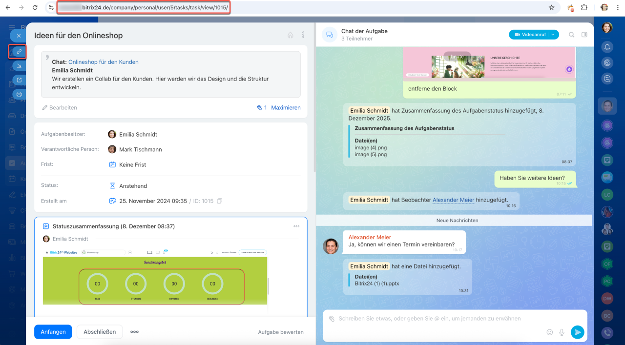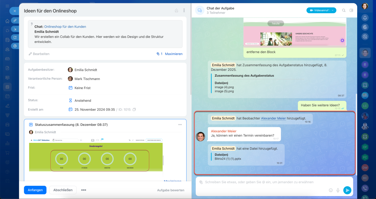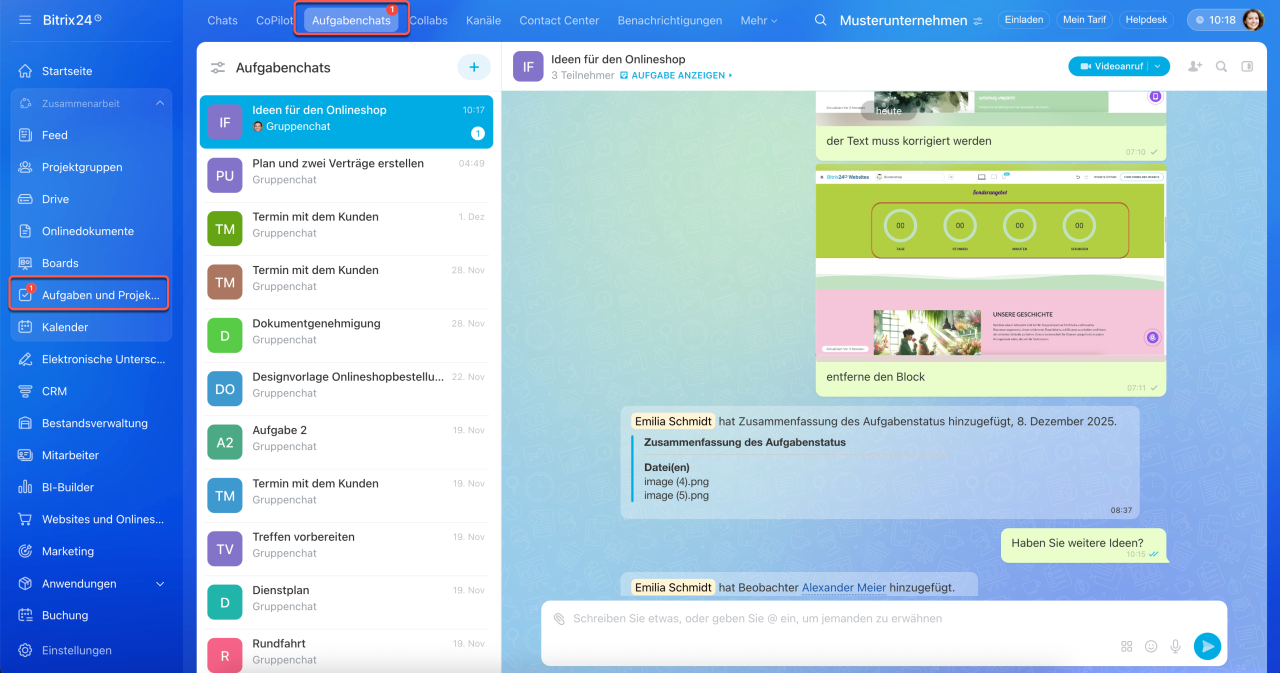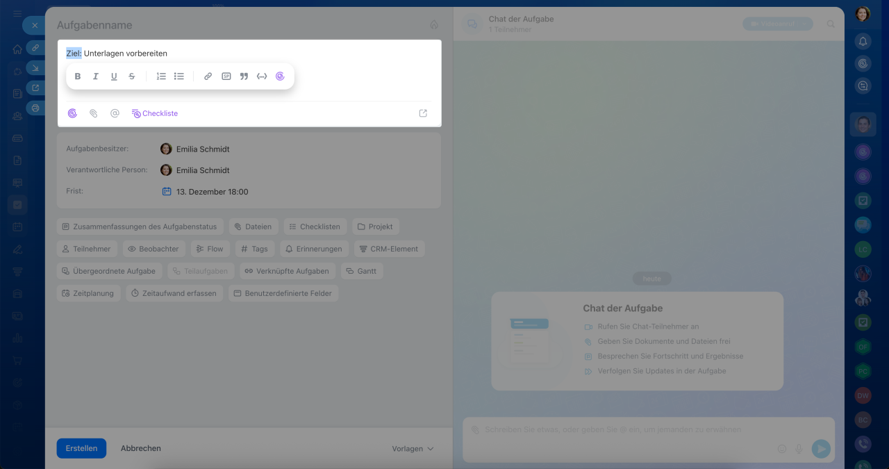 Neue Aufgaben in Bitrix24 sind mehr als nur ein Formular mit Feldern und Kommentaren – sie bilden einen zentralen Arbeitsbereich, in dem alle Aktivitäten zusammenlaufen: Diskussionen, Aktionen und Ergebnisse. Der Aufgabenchat dient dabei als Kommunikations- und Steuerungszentrum. Ihr Team kann direkt dort telefonieren, Dateien teilen und Entscheidungen treffen, ohne den Kontext zu verlieren oder Zeit durch den Wechsel zwischen verschiedenen Tools zu verschwenden.
