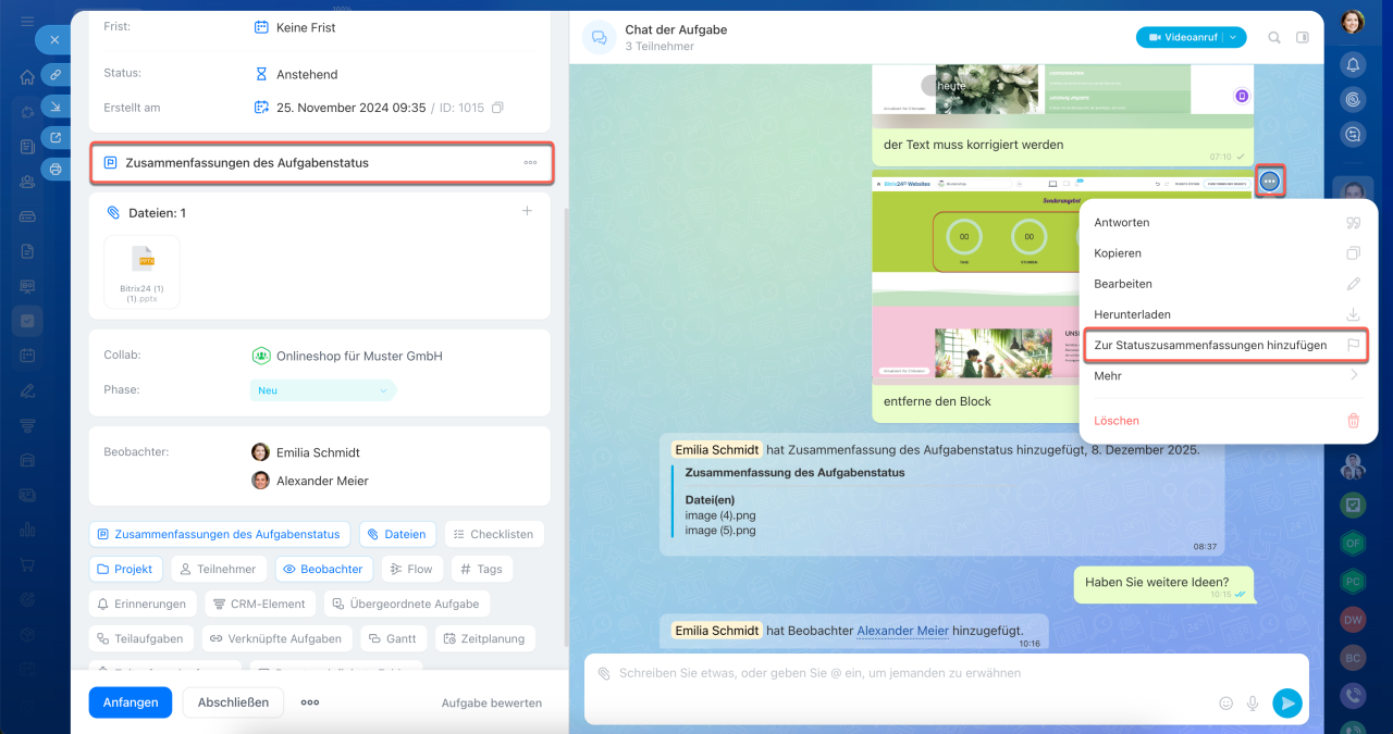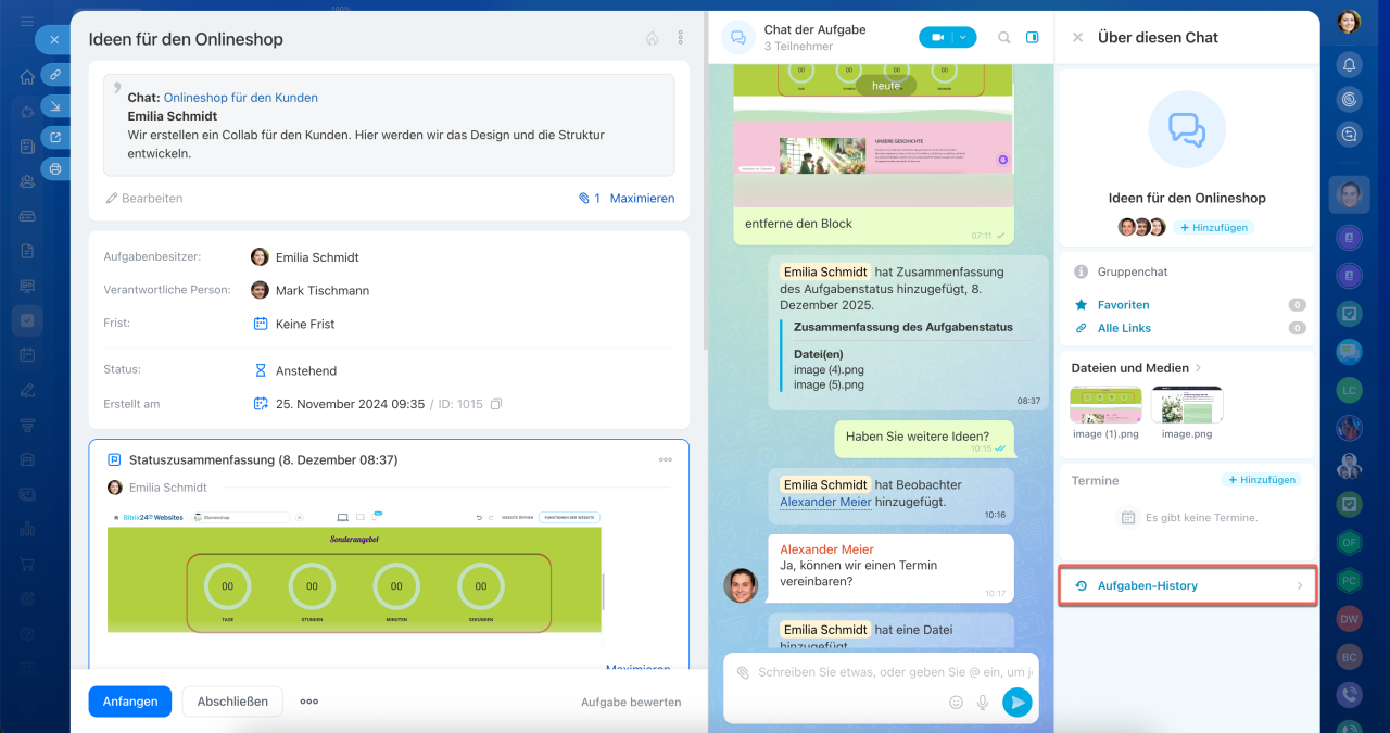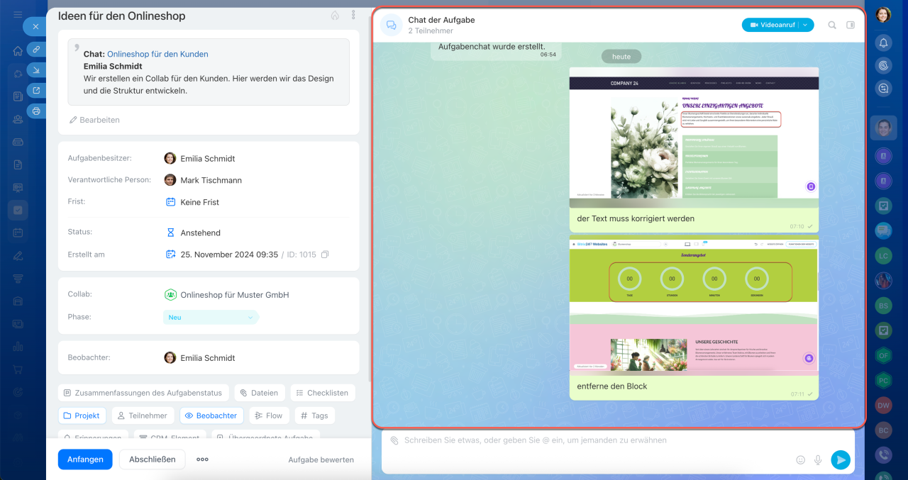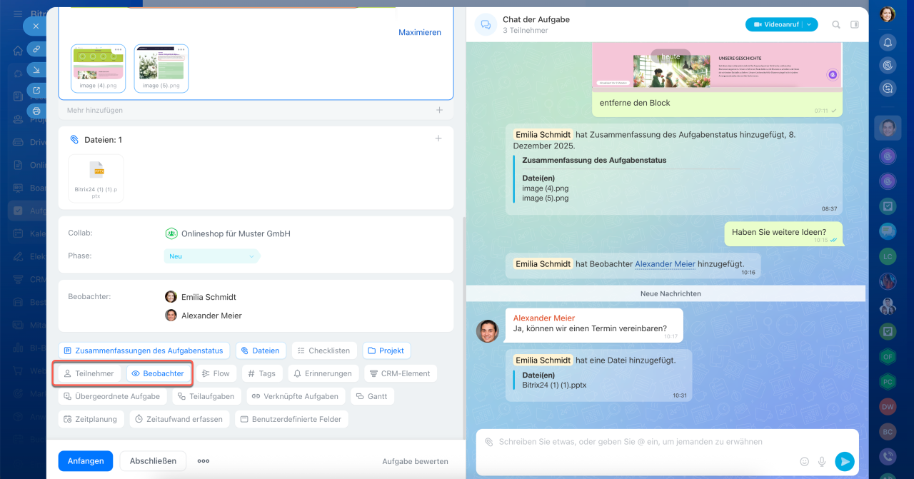 Neue Aufgaben in Bitrix24 sind mehr als nur ein Formular mit Feldern und Kommentaren – sie bilden einen zentralen Arbeitsbereich, in dem alle Aktivitäten zusammenlaufen: Diskussionen, Aktionen und Ergebnisse. Der Aufgabenchat dient dabei als Kommunikations- und Steuerungszentrum. Ihr Team kann direkt dort telefonieren, Dateien teilen und Entscheidungen treffen, ohne den Kontext zu verlieren oder Zeit durch den Wechsel zwischen verschiedenen Tools zu verschwenden.