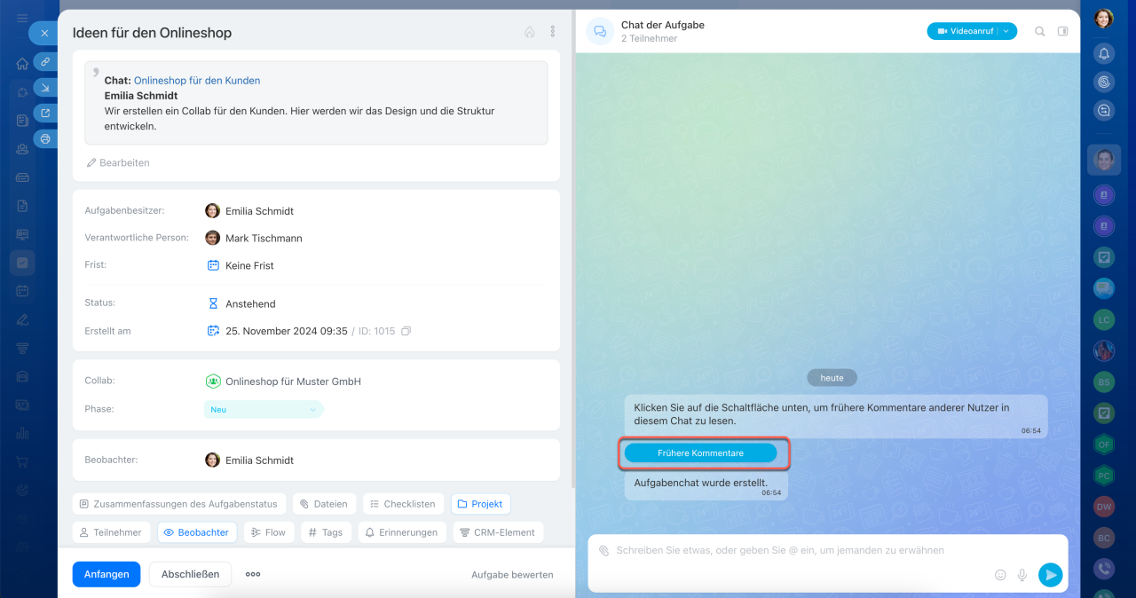 Wenn der Chat nicht erscheint, führen Sie eine beliebige Aktion in der Aufgabe aus – der Chat wird dann erstellt.